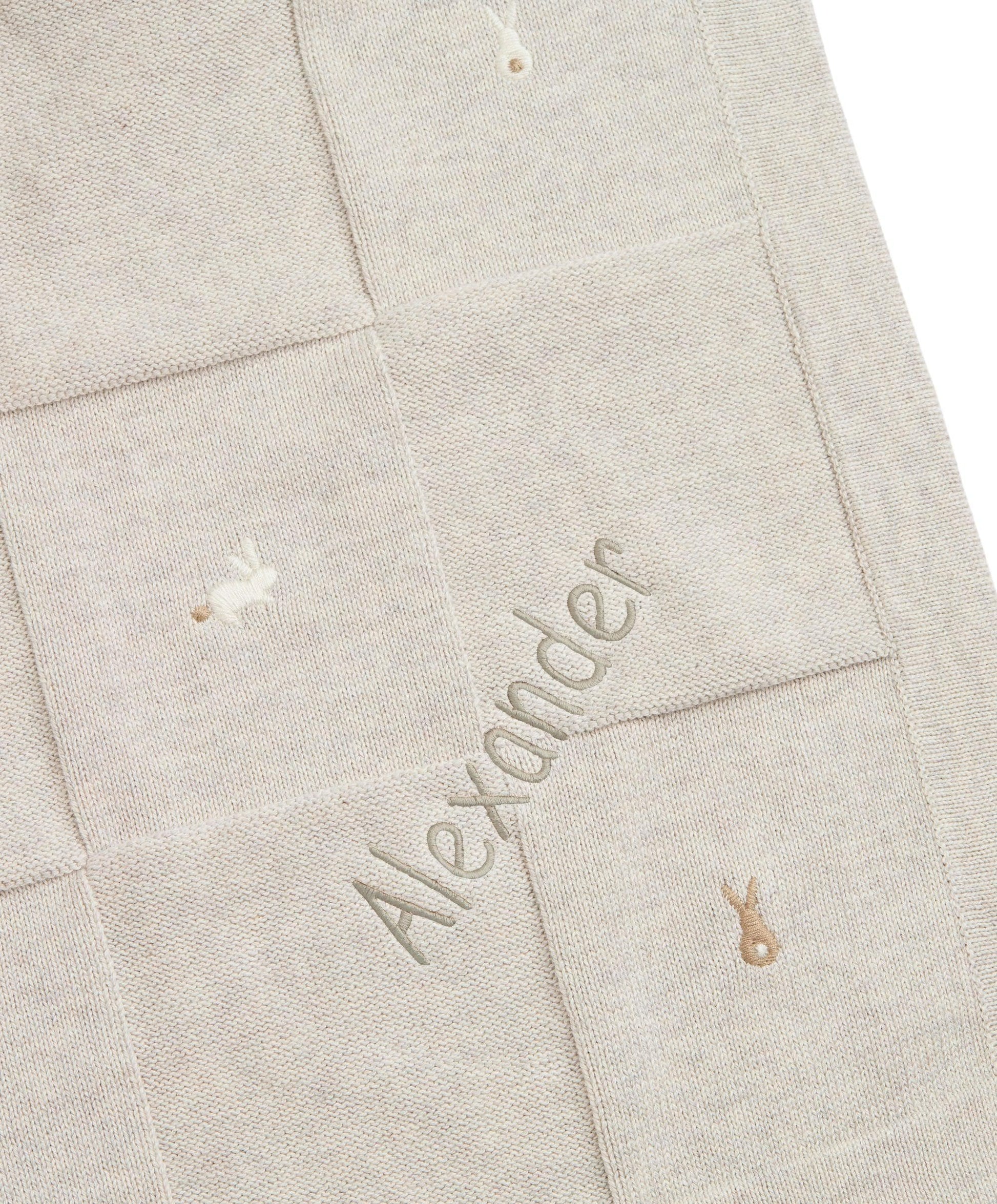 An adorable soft cotton blanket in gentle grey and neutral tones. Featuring a patchwork knitted design and delicate embroidered bunny detailing, it's as cosy as it is cute. Machine washable.