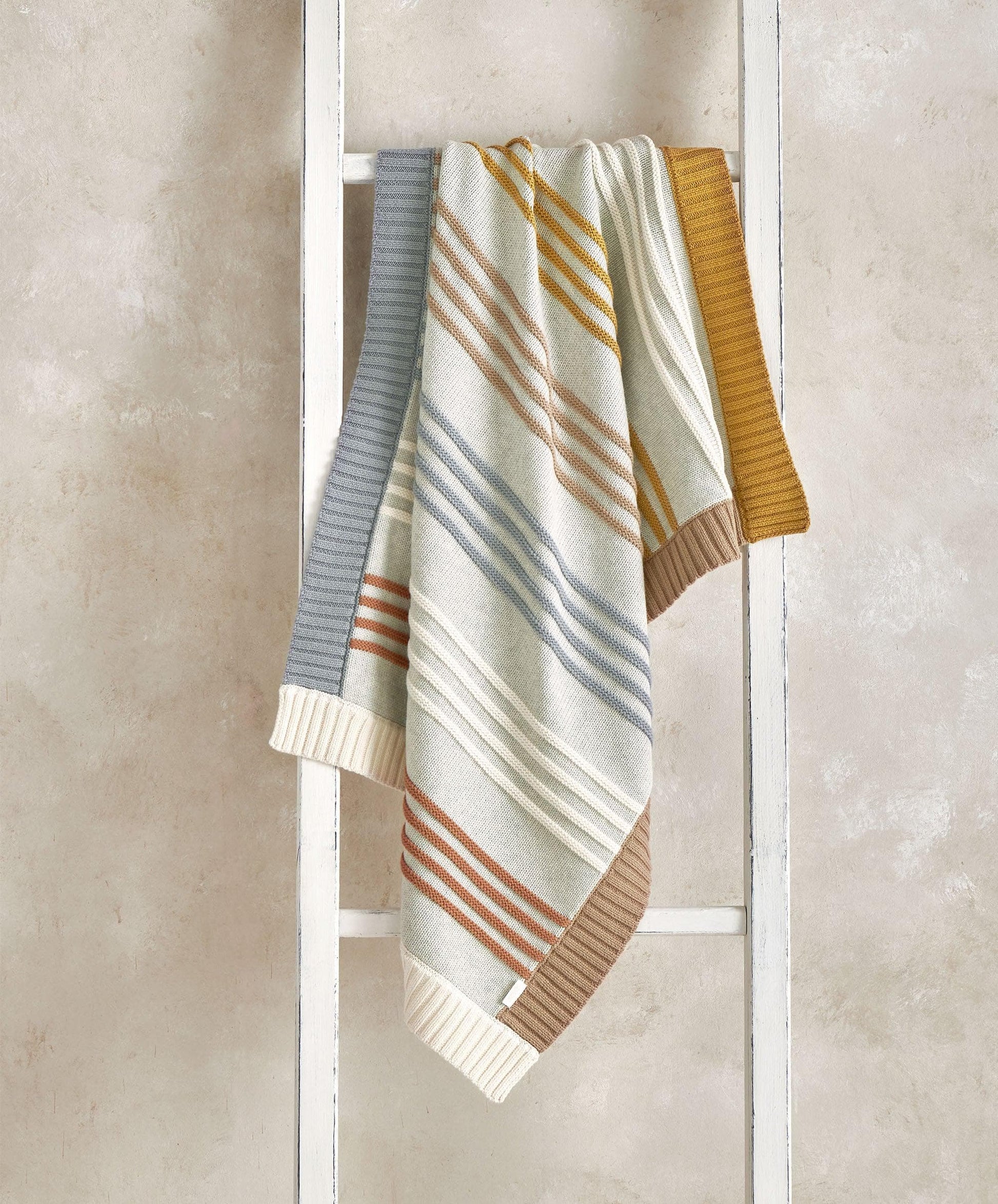 Super-soft, thick knitted blanket featuring a modern stripe design in colourful tones, made from 100% cotton. Machine washable.