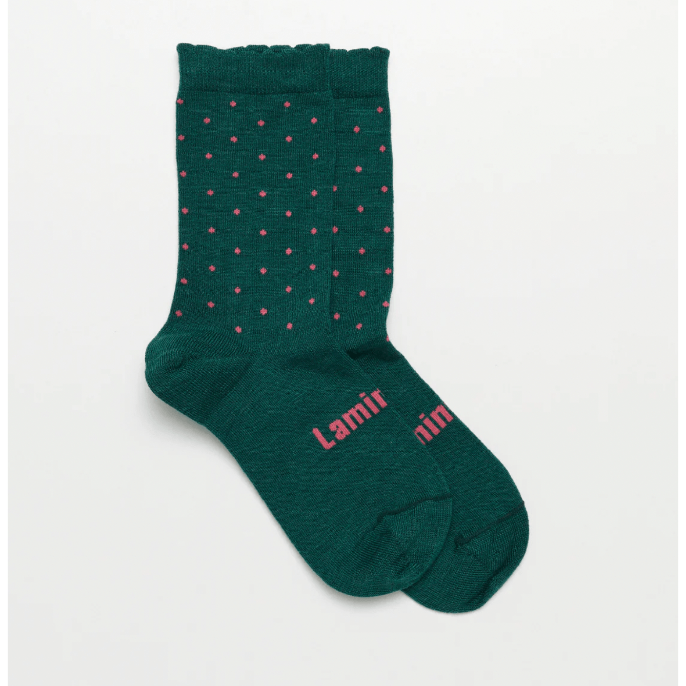 Brighton - Dark blackboard green with small chrysanthemum spots merino wool crew socks for children.