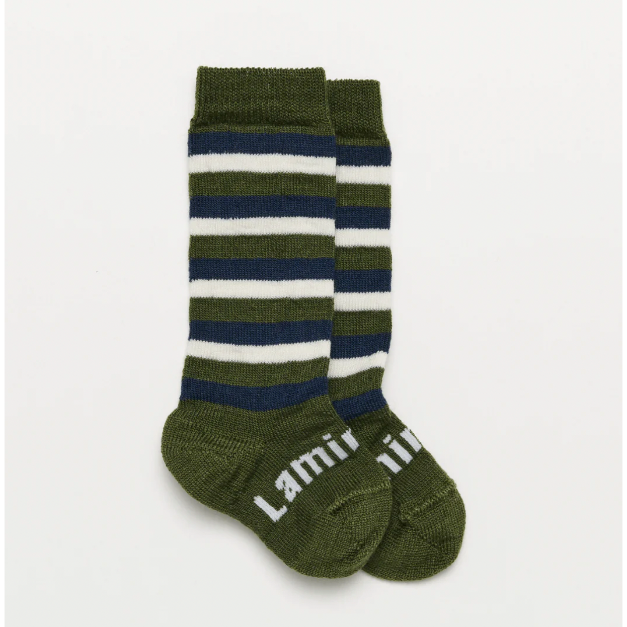 Grover - Blue, green and natural striped merino wool knee-high socks for babies.