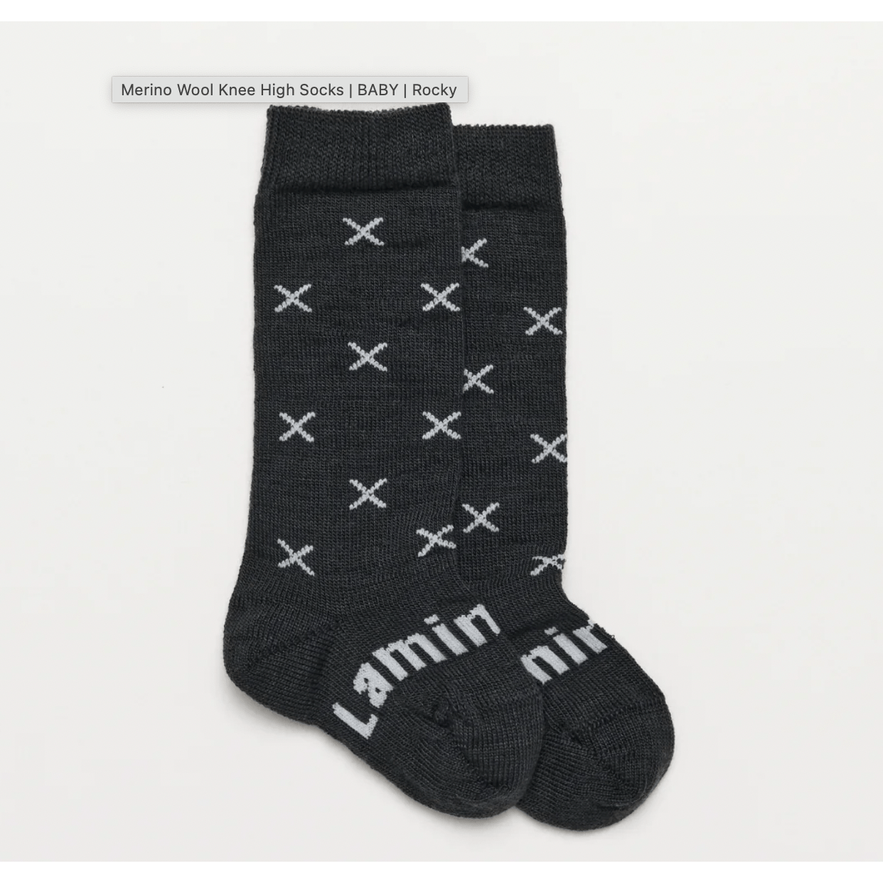 Rocky - Charcoal with natural crosses merino wool knee-high socks for babies.