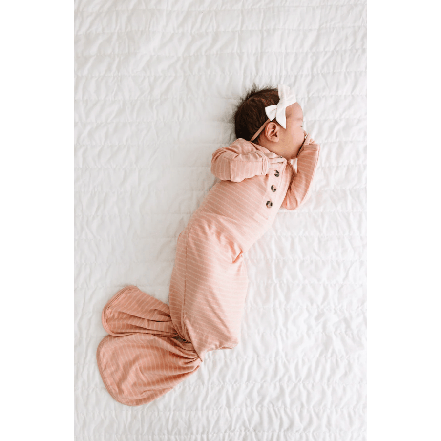 The easiest tie-bottom outfit for day or night. Made for hassle free diaper changes and gentle dressing, I designed this with a button-down front and tie bottom for simple closure (no more snaps at 2am!). Fold over wrist cuffs are the most thoughtful finishing touch.