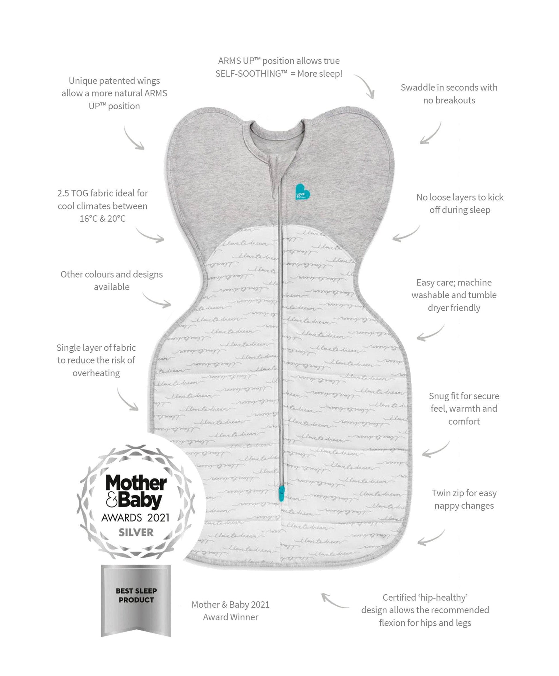 Combining the benefits of traditional swaddles and the ease and safety of a sleepsuit, the Love To Dream Swaddle Up™Warm is the perfect tool to reduce sleepless nights. The soft, clingy fabric wraps around baby to replicate the feeling of being in the womb, whilst the ARMS UP™ hip-healthy design aids their natural sleeping position.