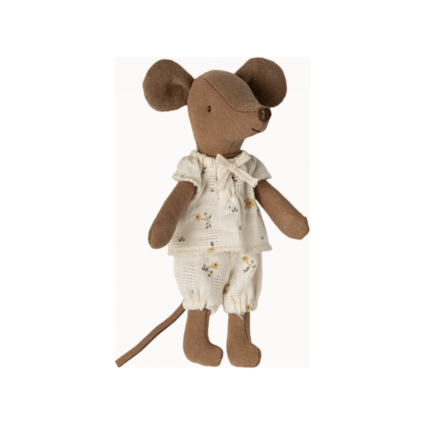 A classic Maileg item. This mouse is ready for hours of play and sleeps tight in the little matchbox. The clothes and bedlinen are made of soft fabrics with unique prints in beautiful colors. Extend the story by adding accessories to the play!
