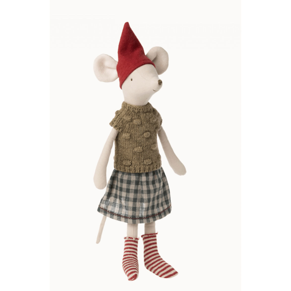 A medium size mouse dressed in cozy Christmas clothes ready to celebrate the wonderful days of Christmas.
