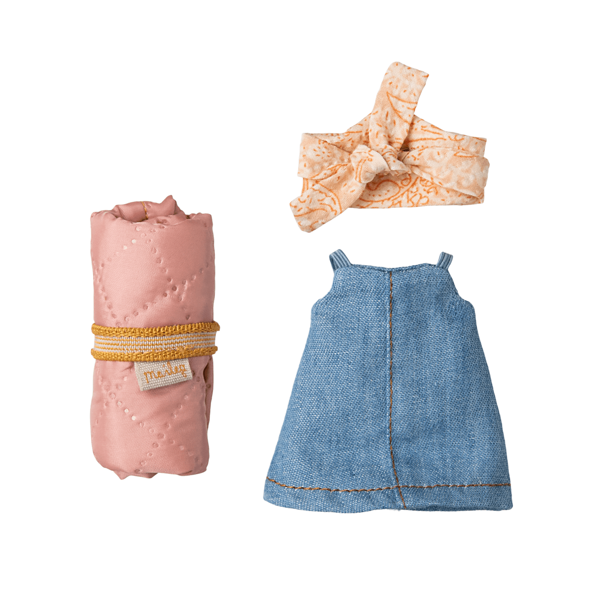 This mouse is well-prepared for a hiking trip in the wild nature. She is dressed for days of walking and brings her sleeping bag for nights under the stars. She has magnets in her hands. Add more accessories from the hiker collection for more play.