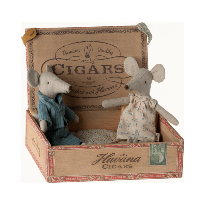 A classic Maileg item. Mum and Dad mice are wearing their beautiful nightwear and eye masks. The cigar box is a perfect bed for a good night’s sleep and sweet dreams. Bed linen may vary in color.