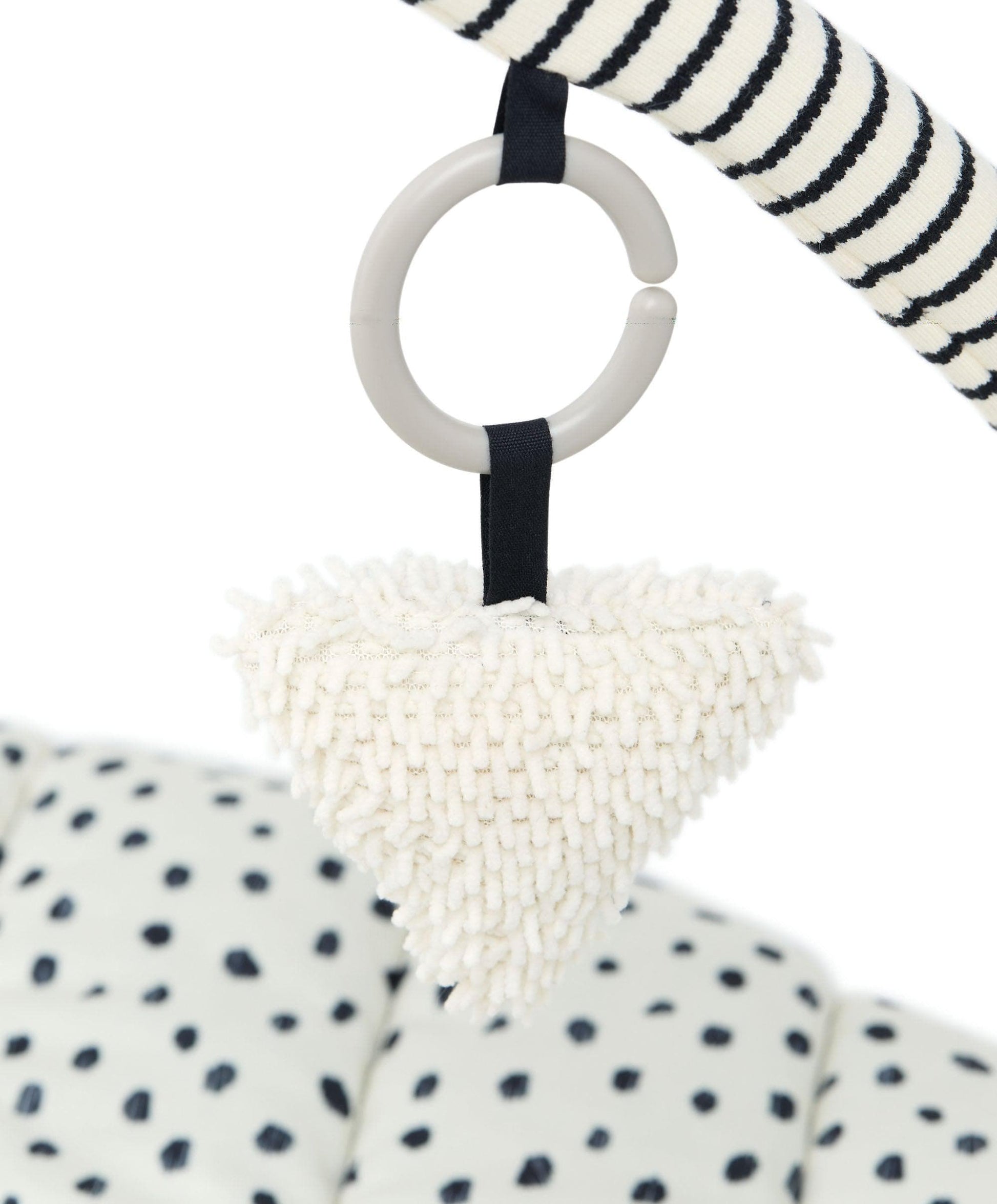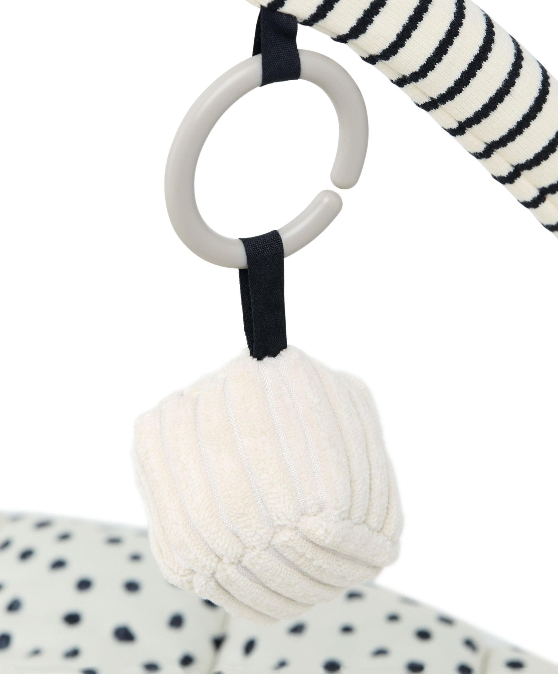 - Newborn playmat packed with interactive sensory experiences, including squeaker, crinkle, rattle, chime and four detachable, soft hanging toys. Featuring high contrast monochrome patterns that help stimulate visual focus and support visual development from day one.