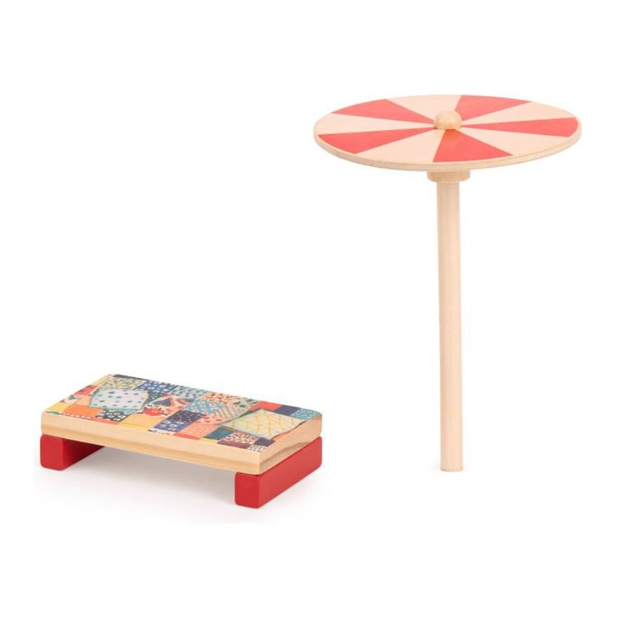 Made entirely of wood, it features a furniture set, gingham fabric curtains and a removable roof for nights under the stars. It can be attached to a car with a towbar.