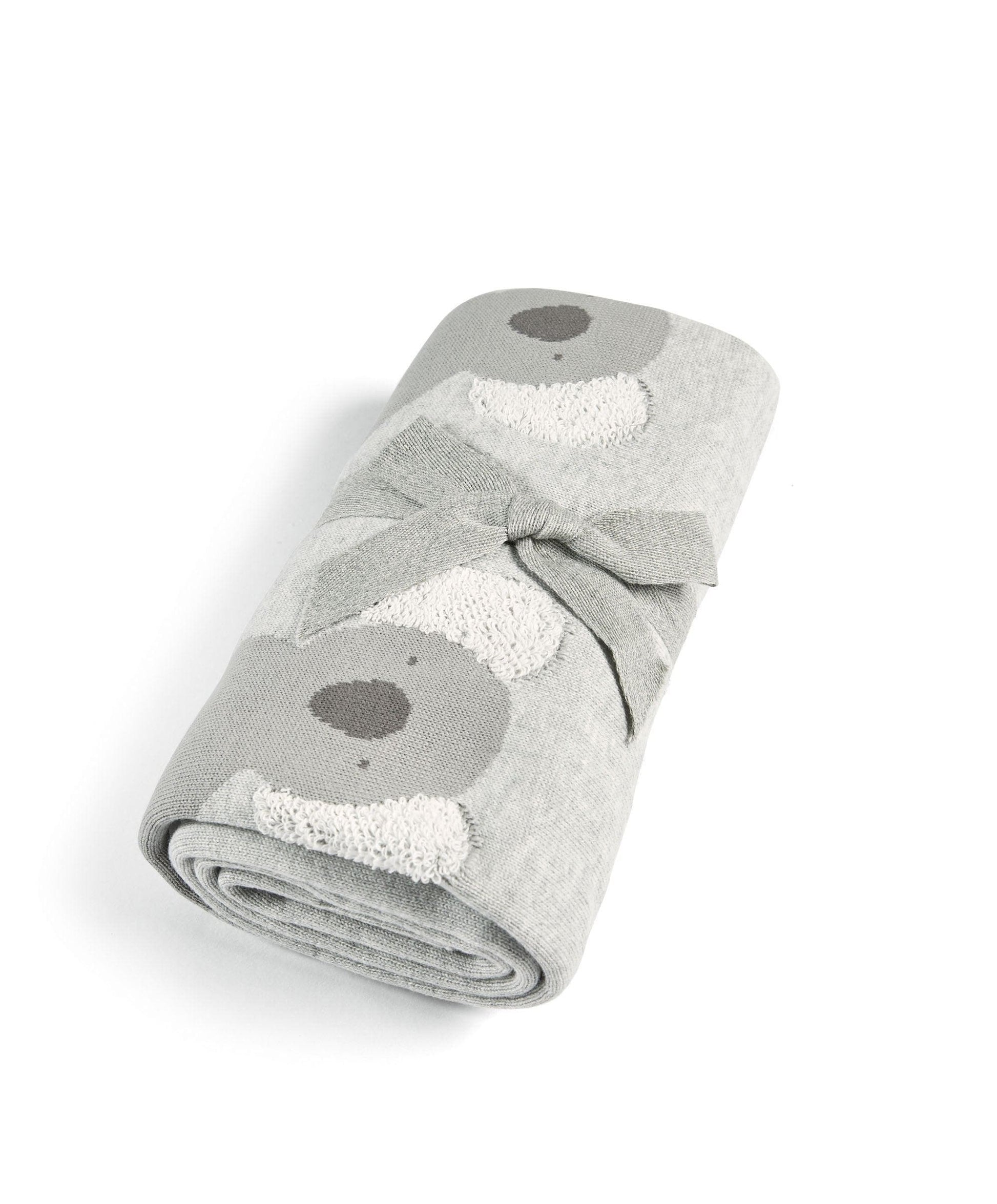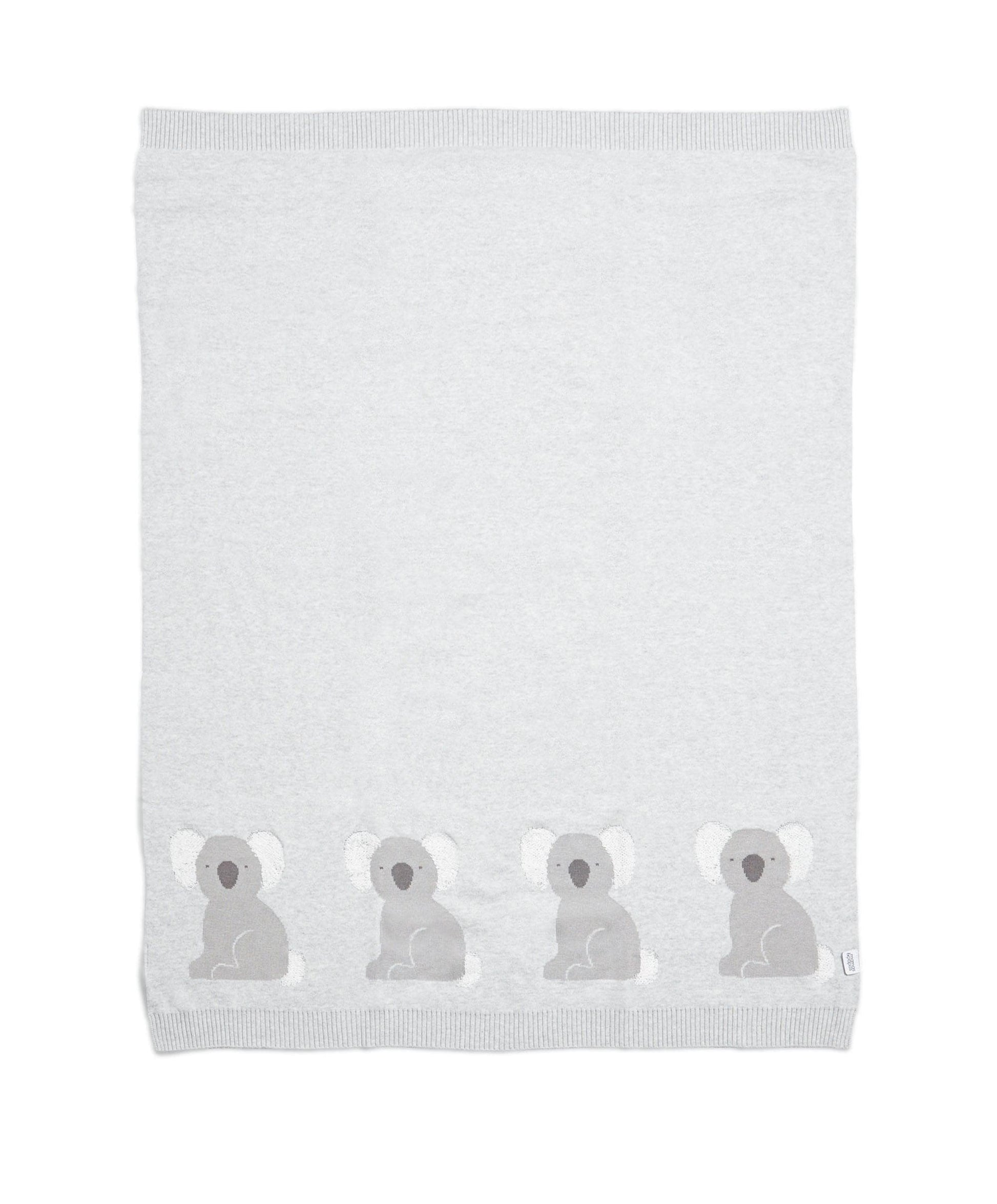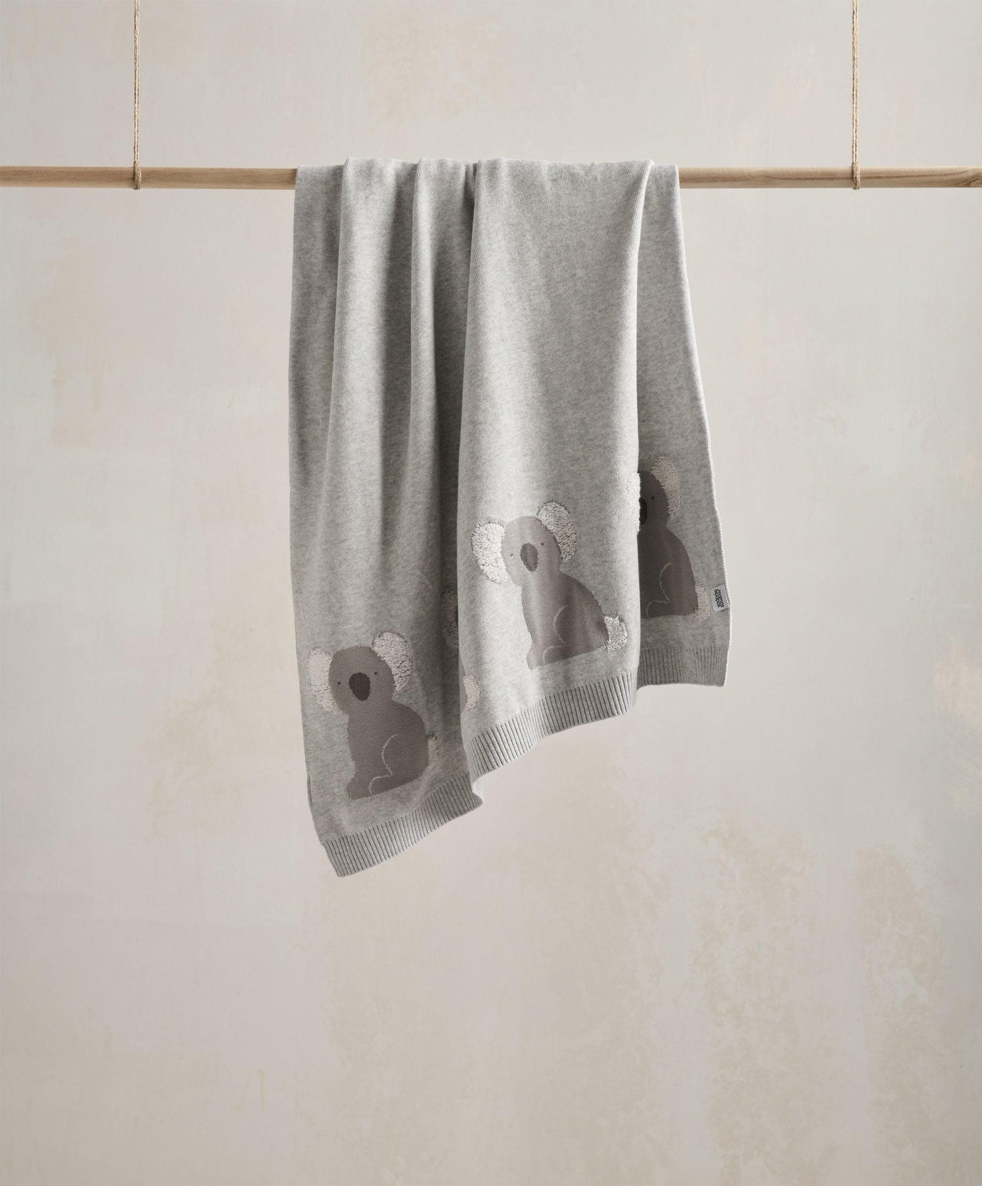 Knitted blanket with grey koala embroidered design. Made from soft 100% cotton.