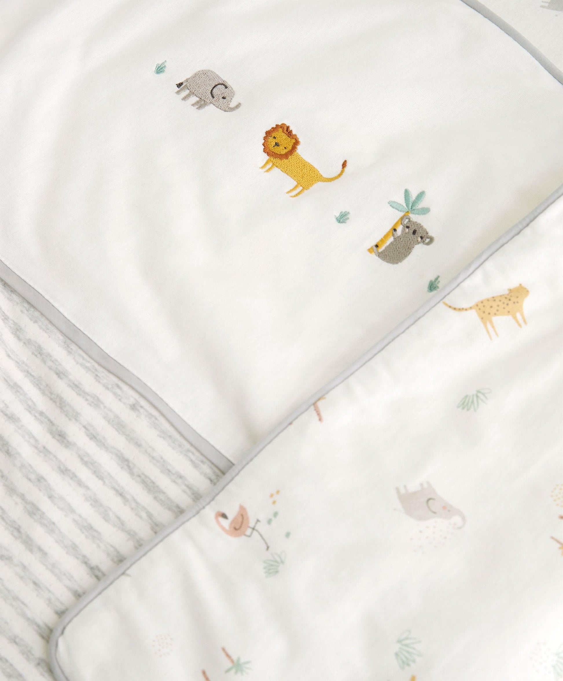 Unisex 2.5 tog dreampod suitable for 0-6 months. Made from soft jersey cotton. Neutral grey and white colours and playful safari animal print, with shoulder poppers and side zip fastening to make getting them ready for bed a breeze.