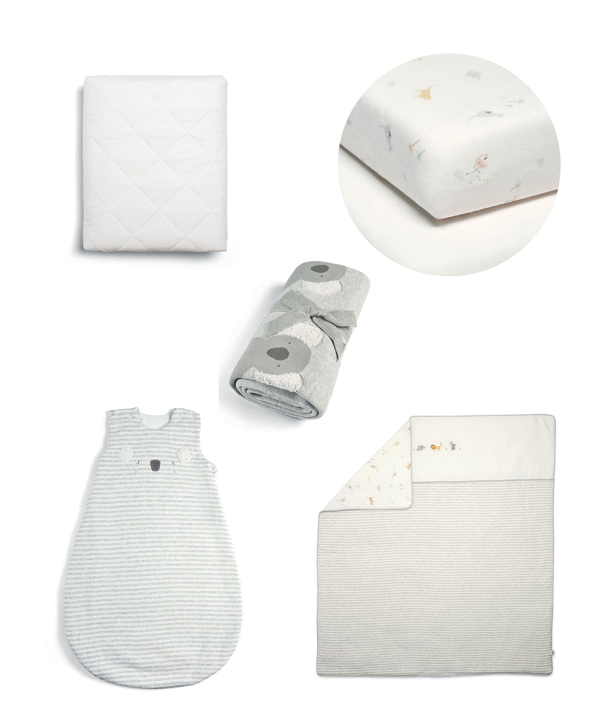 This bundle includes: Wildly Adventures Quilt - 2.5 Tog, Wildly Adventures Cotbed Fitted Sheets (Pack of 2), Wildly Adventures Dreampod 0-6 months 2.5 Tog, Blanket Knitted – Koala & Anti-Allergy Quilted Cotbed Mattress Protector.