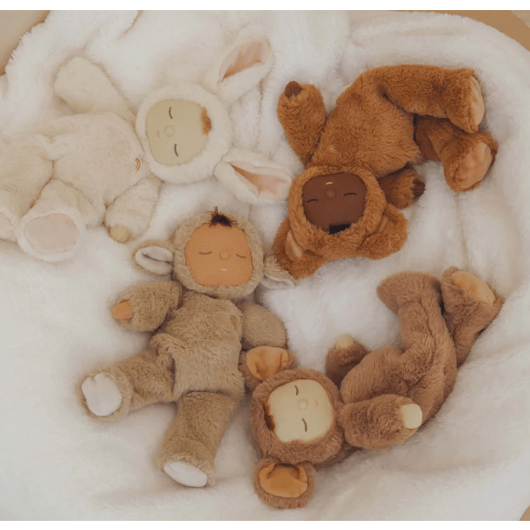 - Cozy Dinkum Dolls can be posed in multiple sleeping positions with their head, arms and legs joined to their body by an interior fabric tape.
