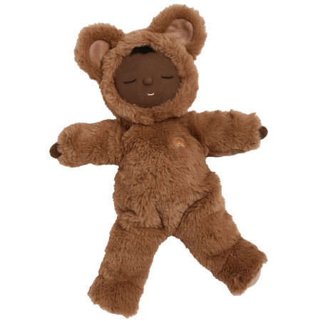 Teddy Mini is posable, made from the plushest outer and features the sweetest embroidered face with a little tuft of hair. Each Cozy Dinkum wears a non-removable suit with two soft furry ears and a rainbow right over their heart.