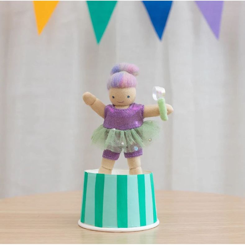 Meet Adara The Acrobat, the gravity-defying daydreamer of the Holdie™ Circus! Does she walk on air? She’ll never tell! Adara is the graceful, daring, and magical acrobat who transforms every moment into a thrilling adventure. With a twirl here and a flip there, Adara turns every performance into a playful circus extravaganza! Each Holdie Folk is posable and comes dressed in a removable outfit, perfect for imaginative play. These tiny folk are handmade, making each one unique and special. Adara The Acrobat is a collectible toy – a must-have for any kids circus toys collection. Collect all of the Holdie Circus Folk to create your very own magical circus.