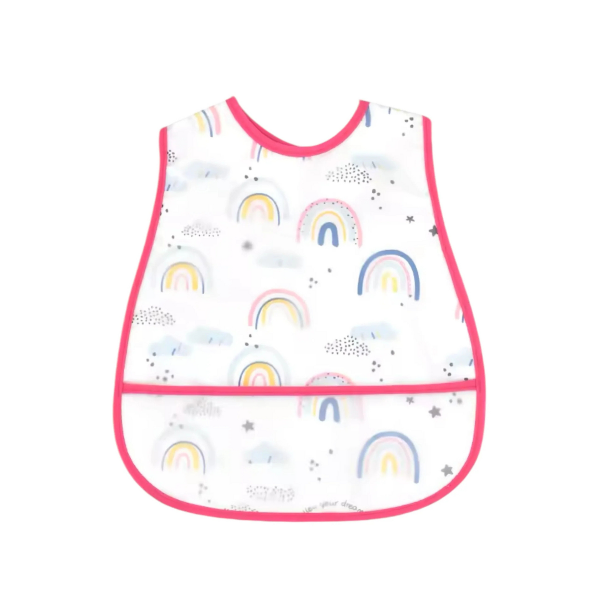 Brighten up every bite with our Rainbow Dreams Waterproof Smock Bib. The cheerful rainbow print and vibrant trim bring fun to mealtimes while the waterproof chest panel and food-catching pouch keep clothes clean and dry. The waterproof midsection and food-catching pouch help minimise mess while keeping your little one dry and comfy.