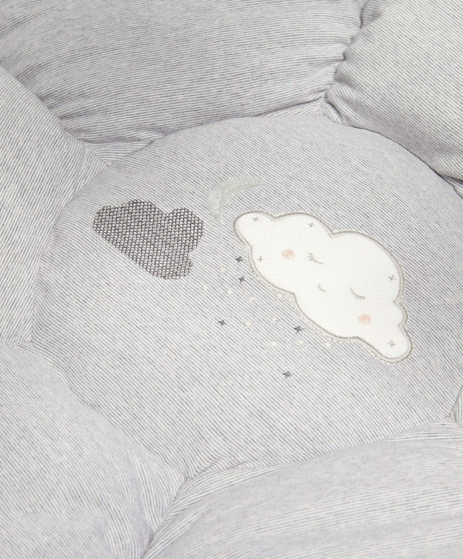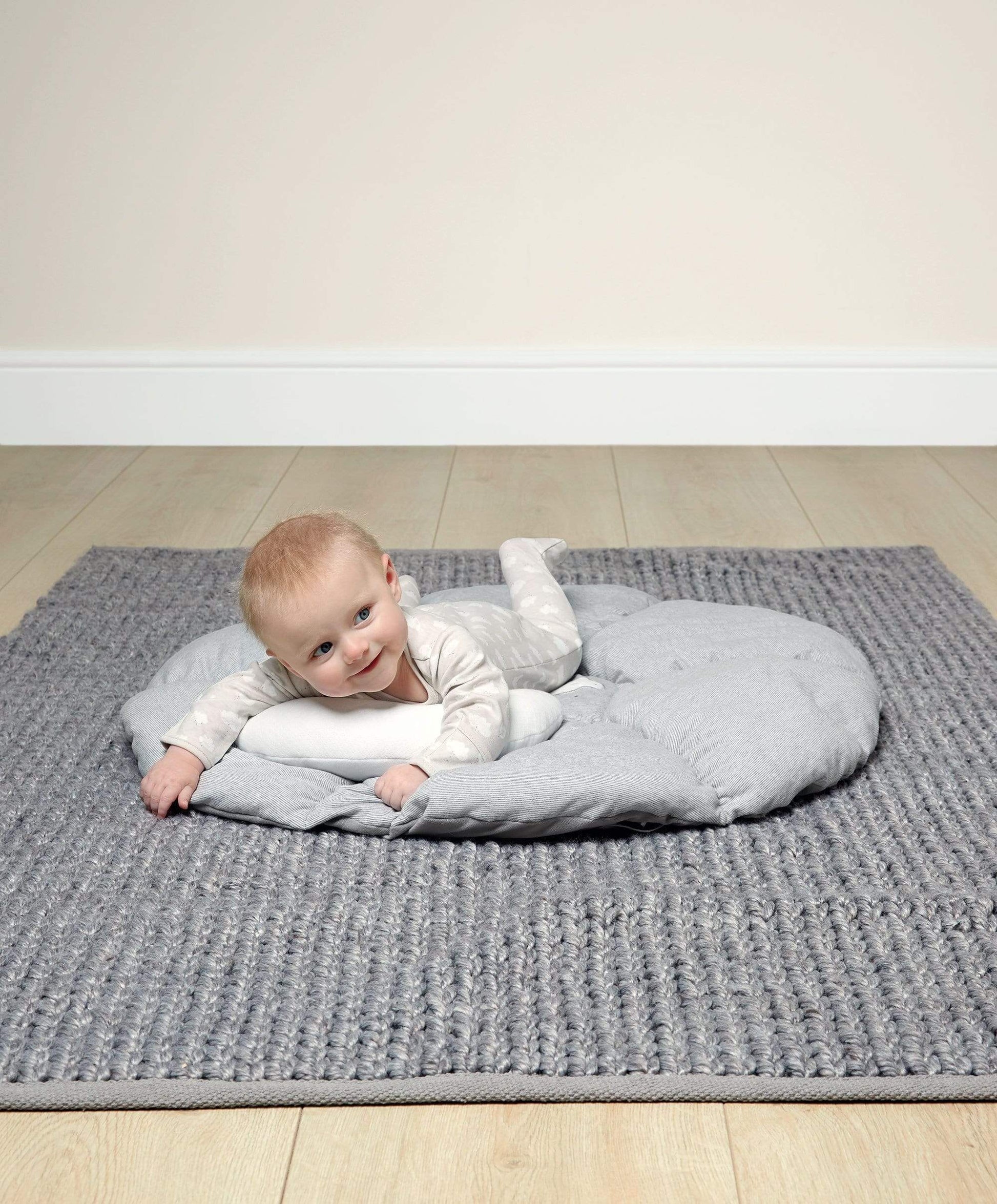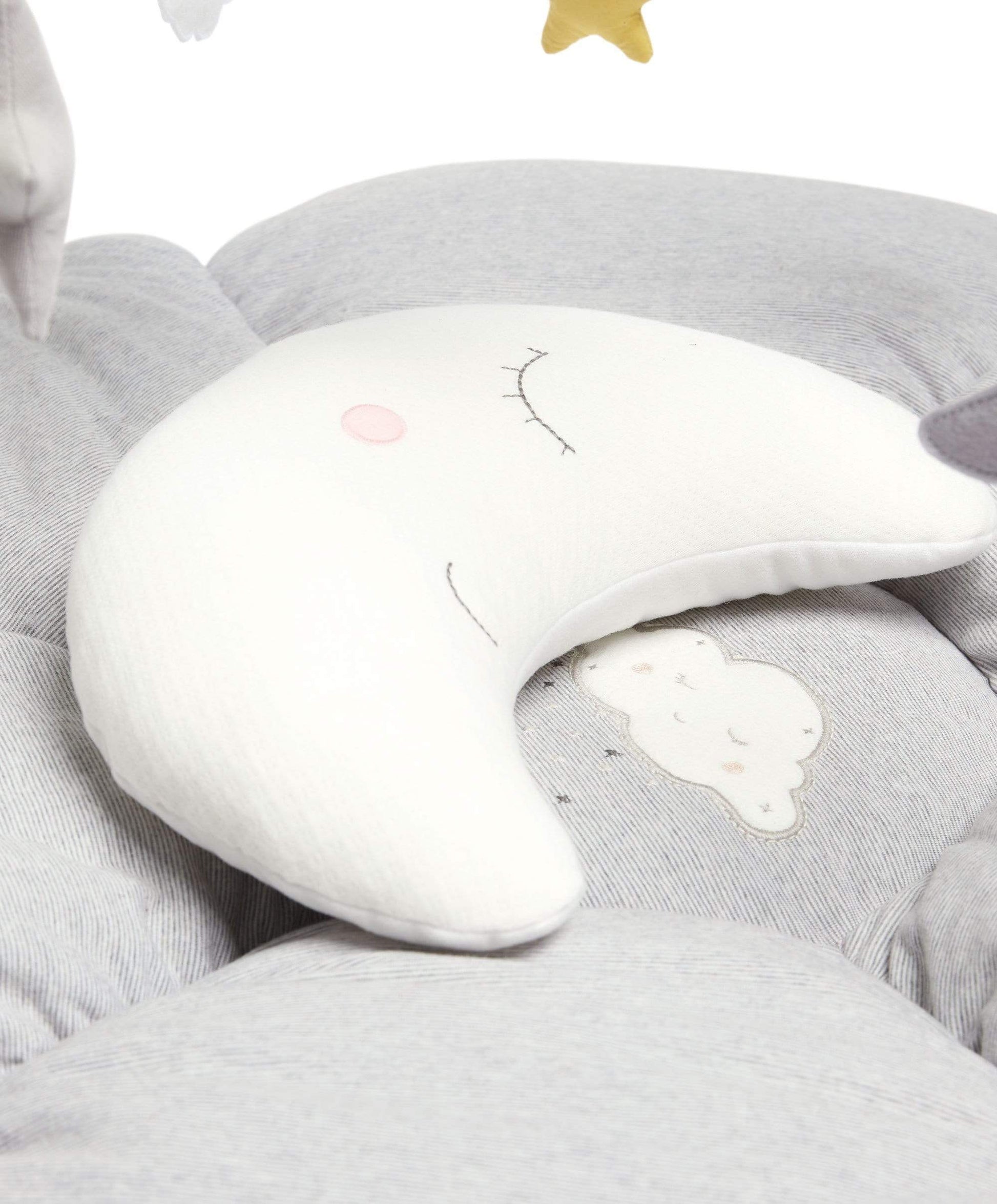 The perfect spot for some chill out time, independent play or to be entertained while you watch on! From the super soft padded mat notice them discover hidden features - a rattle, crinkle texture, musical functions and detachable toys – before practicing some Tummy Time with their moon Tummy Time accessory- the perfect size and shape for helping them safely practice their new skills!
