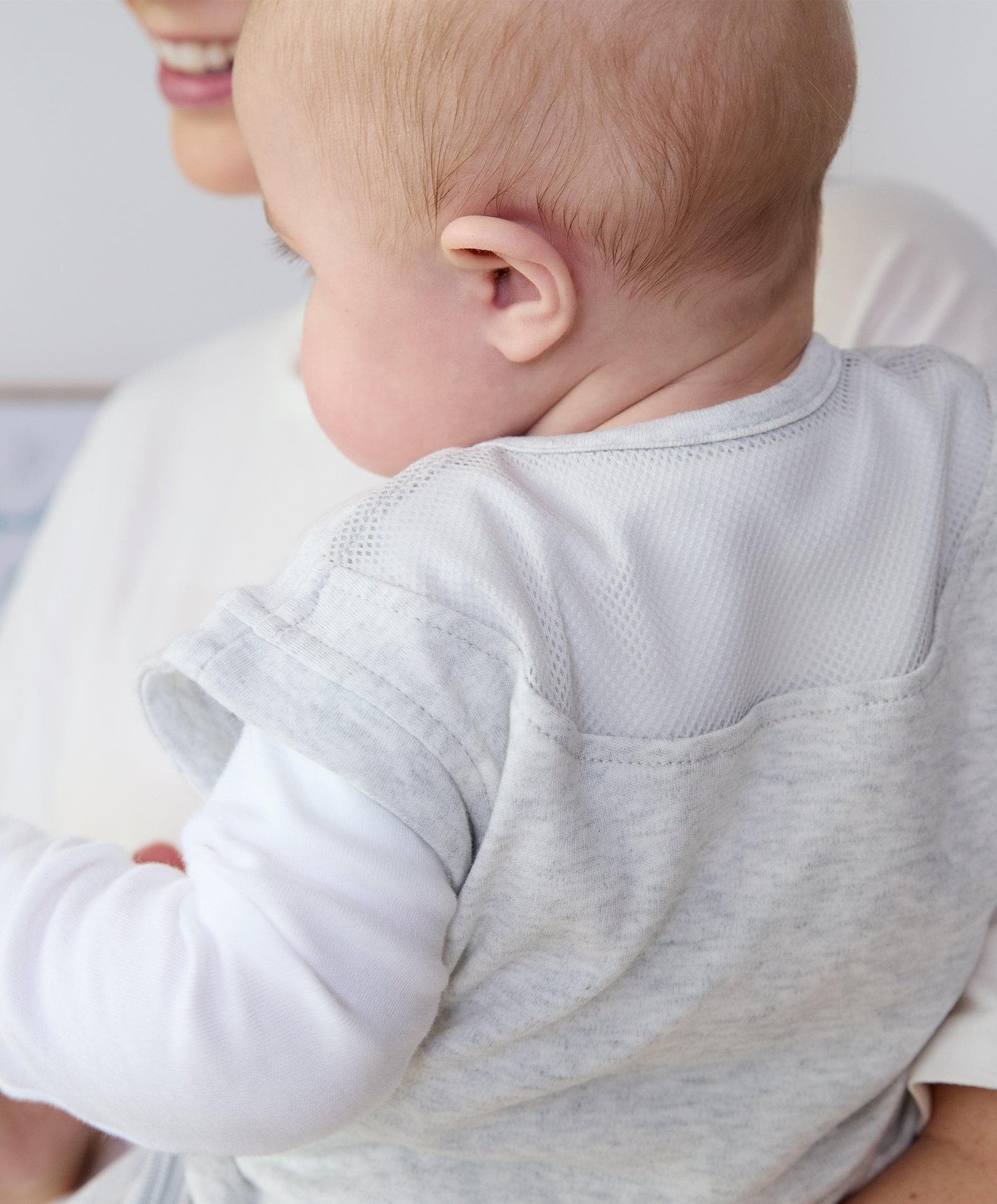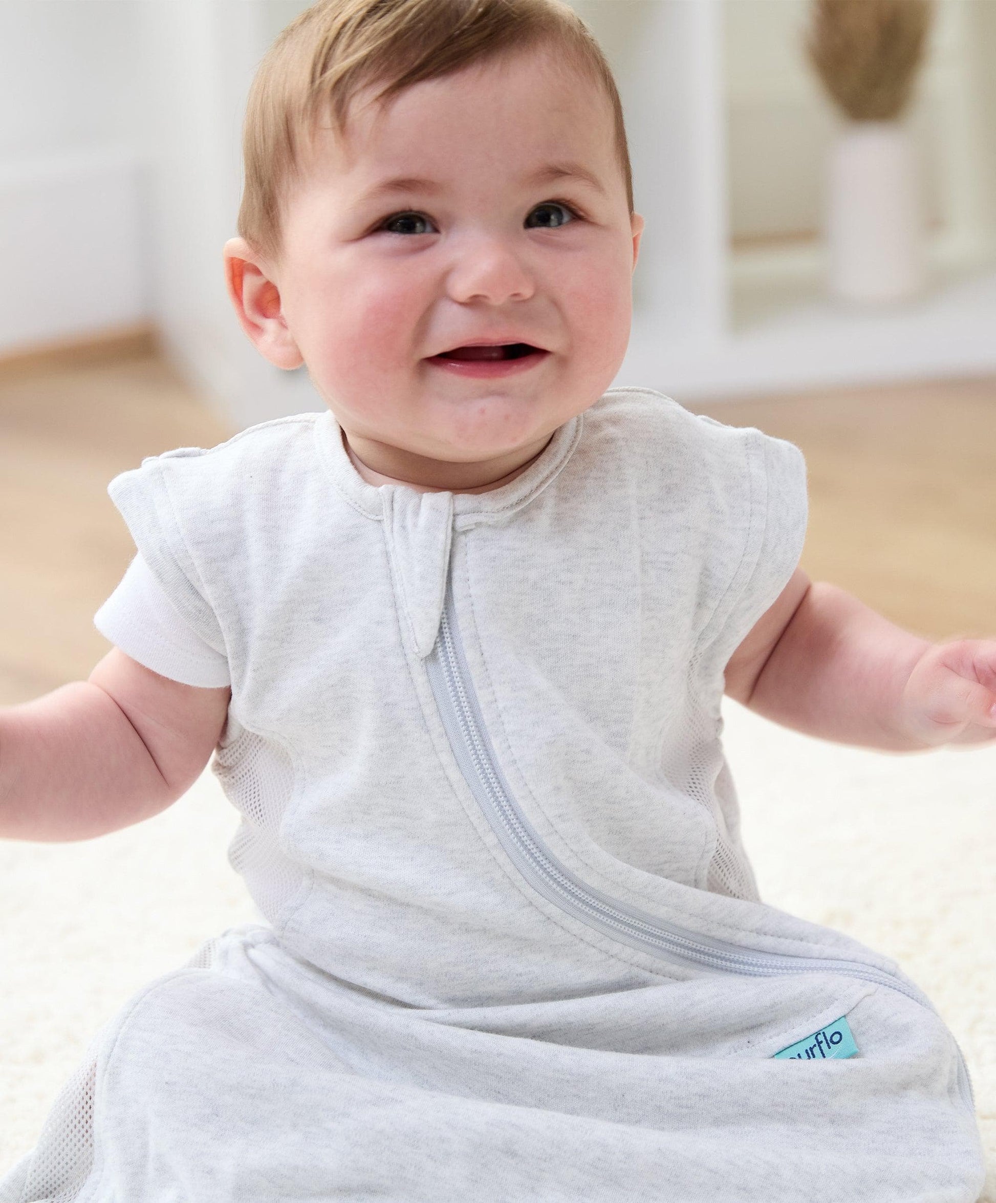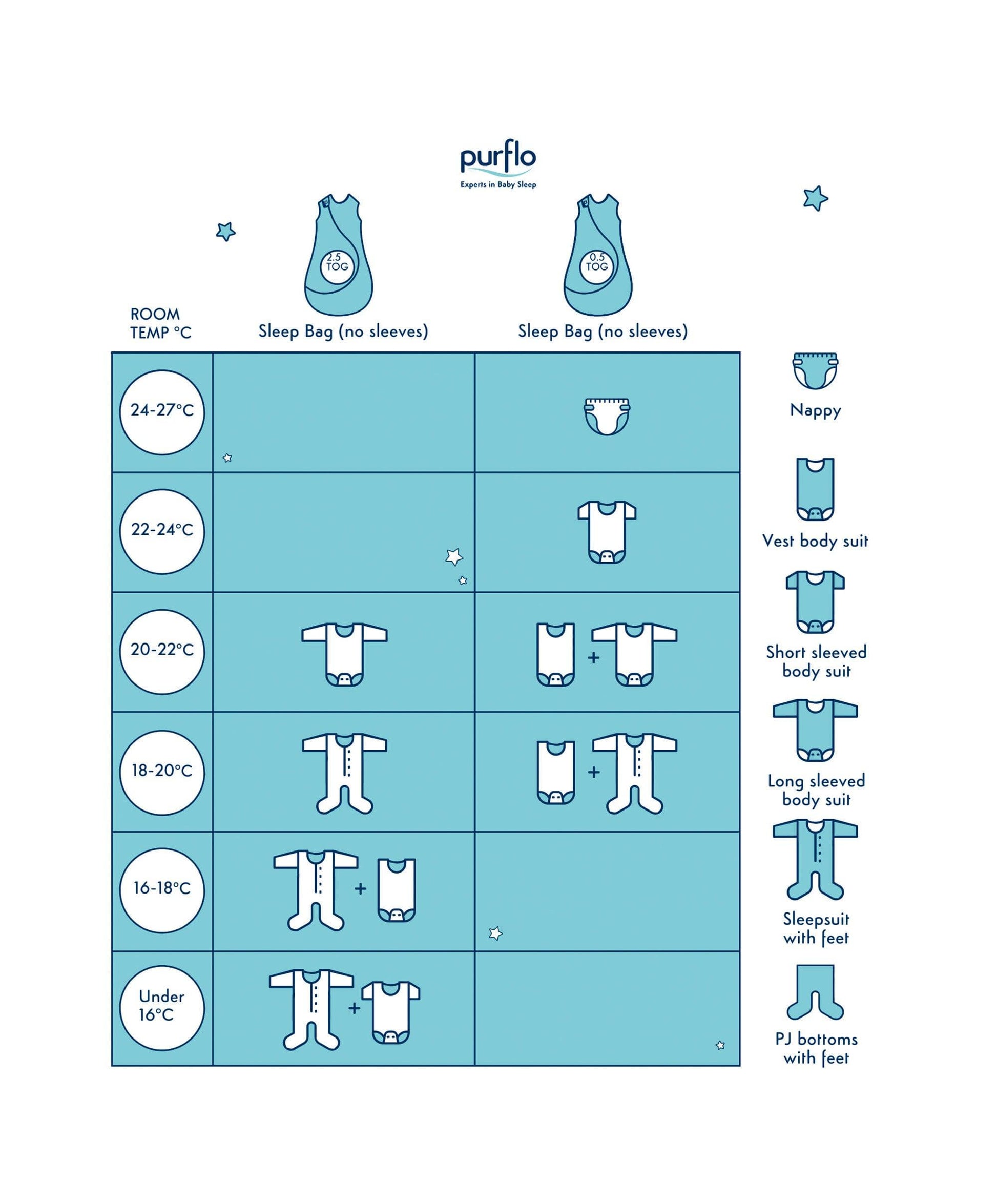 The Cuddle to Sleep Bag has been developed to continue supporting babies from 3 months. It has been designed to allow them to learn to roll without getting tangled up, grow 50% longer, have the leg space to crawl and learn to self soothe with free arms. The Purflo Cuddle to Sleep Bag is the second stage in our Sleep Bag range, which follows on from our Swaddle to Sleep Bag. The Cuddle to Sleep Bag will support the many changes babies go through in their first year while maintaining our breathable mesh panels for ventilation. The Cuddle To Sleep Bag 0.5tog is ideal for use in rooms between 18°C – 27°C with appropriate clothing as suggested.