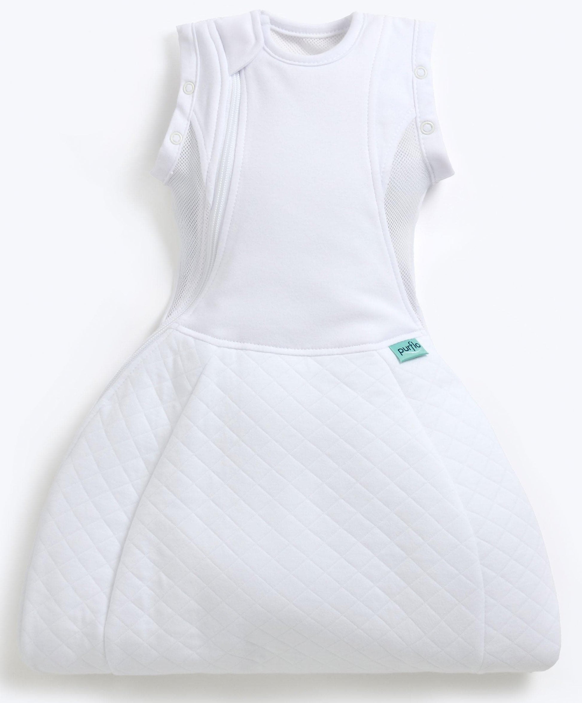 The innovative Swaddle to Sleep Bag has been developed to offer parents a safer, healthier bedding solution for newborn babies. It features unique breathable panels and the option to swaddle arms in or out. The Purflo Swaddle to Sleep Bag grows with new babies with an extendable length that is certified hip healthy by International Hip Dysplasia Institute. The Purflo Swaddle to Sleep Bag is a safe alternative to using blankets and loose bedding at sleep time and helps keep little ones at a safe temperature all year round. The versatile design of this baby sleep bag gives you the option to swaddle baby or let baby’s arms out - growing with your baby from a swaddle to a standard baby sleep bag. The 2.5 tog is perfect for all season use, allowing you to tailor the garments underneath to suit the temperature. The All Seasons Swaddle to Sleep Bag features the addition of Dupont Sorona® that is made from 37% plant based ingredients and is Oeko-Tex® 100 Class 1 Certified.Product Features: