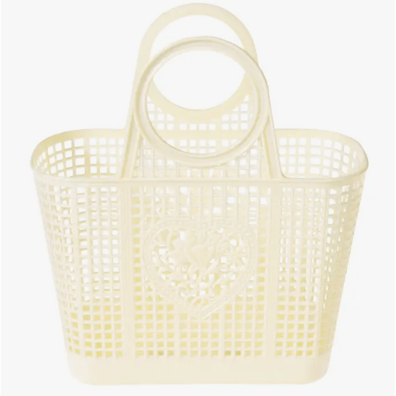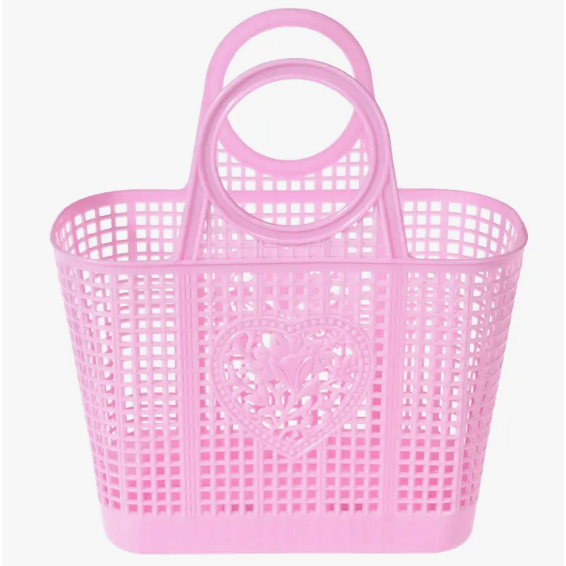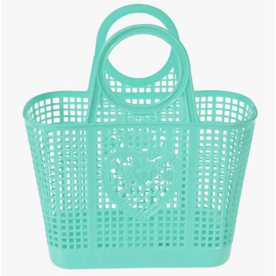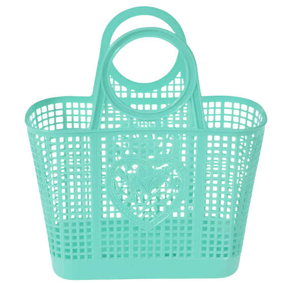 A flexible plastic basket in a soft pastel blue, with heart and flower decorations either side.
