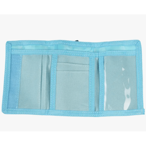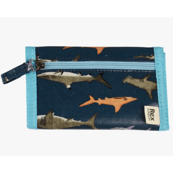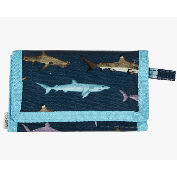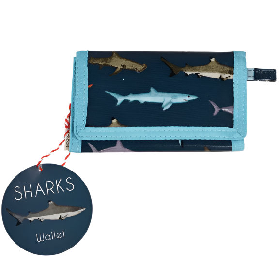 Children's tri-fold wallet in dark blue with our print of various sharks.