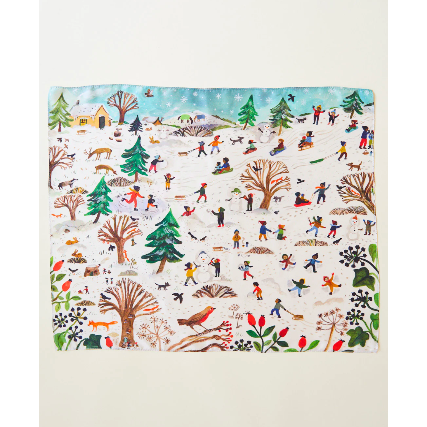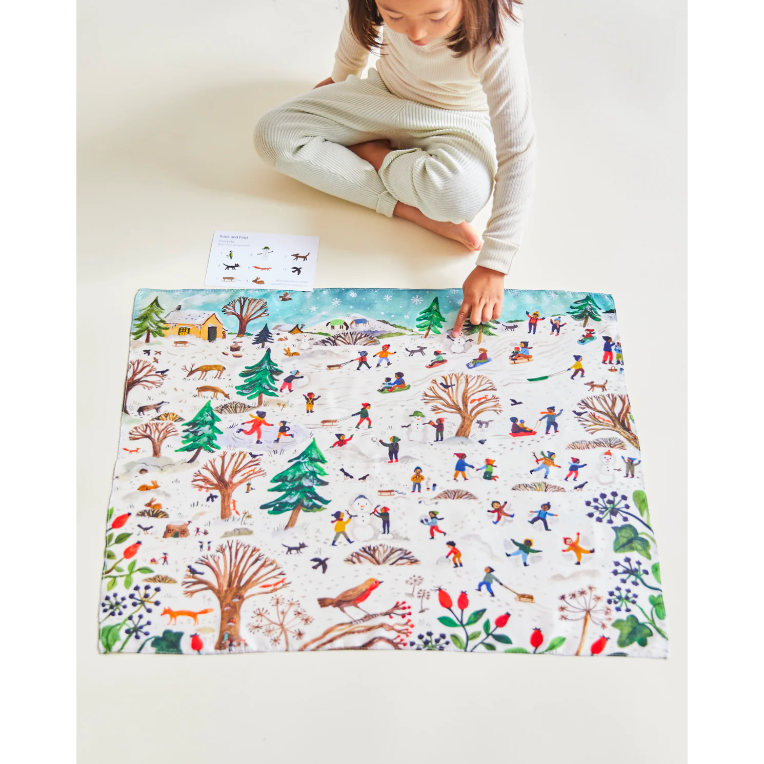 Seek & Find Playsilks are made in collaboration with different artists. The Snowy Day Seek & Find features artwork by Gemma Koomen. Find her at @gemmakoomen on Instagram.