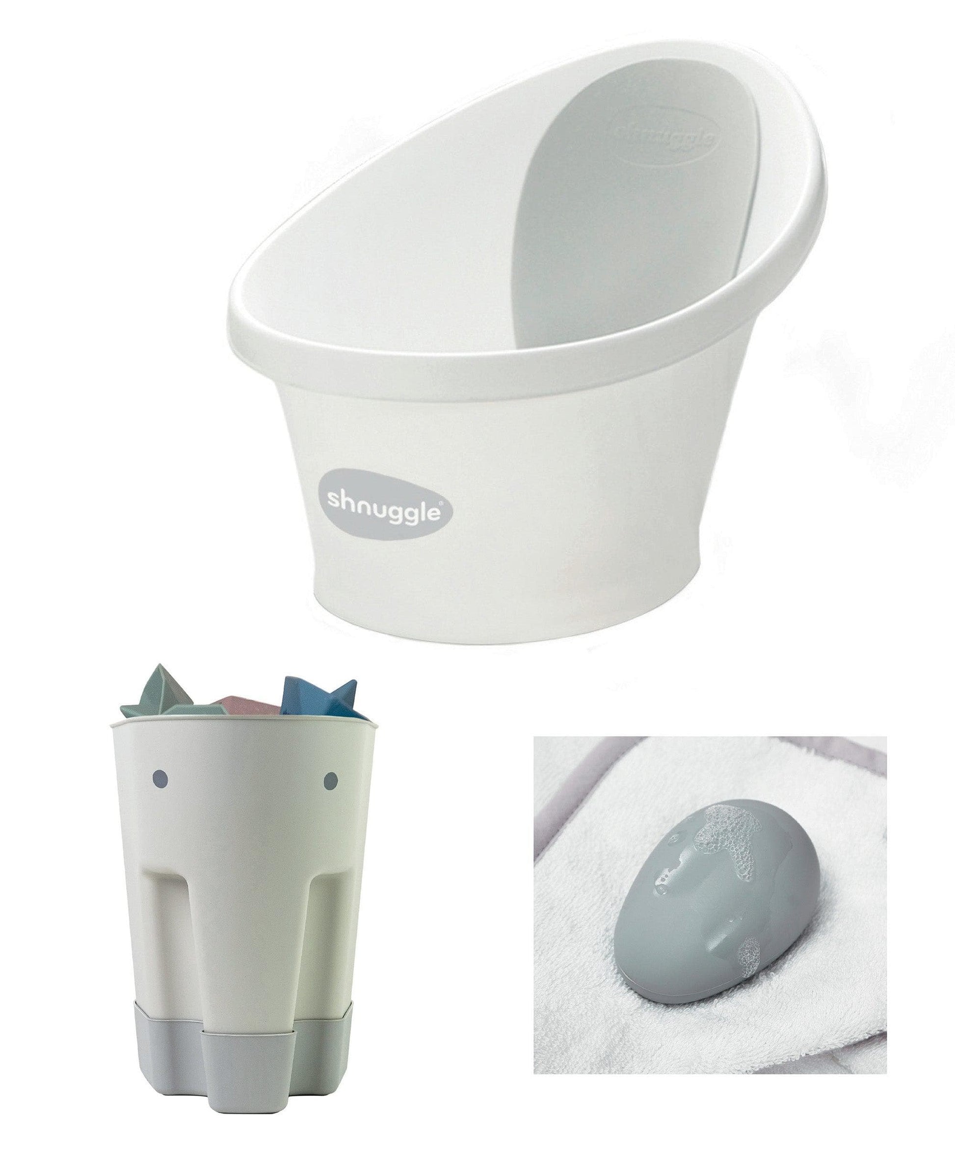 This Bundle includes Shnuggle Newborn Baby Bath – White, Shnuggle Ellie Bath Toy Storage Draining Caddy & Shnuggle Pebbly Bath Thermometer