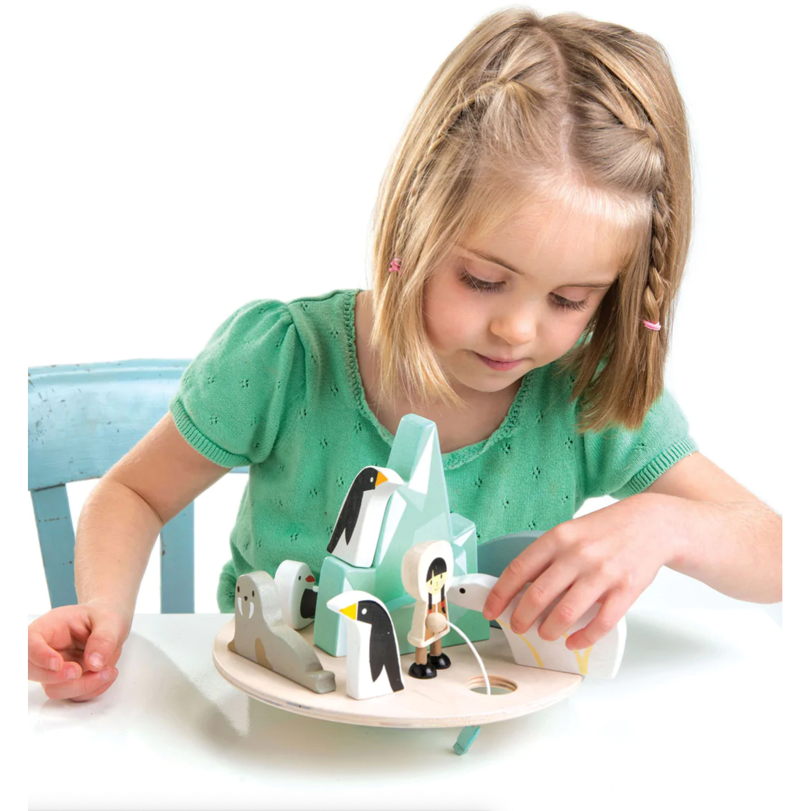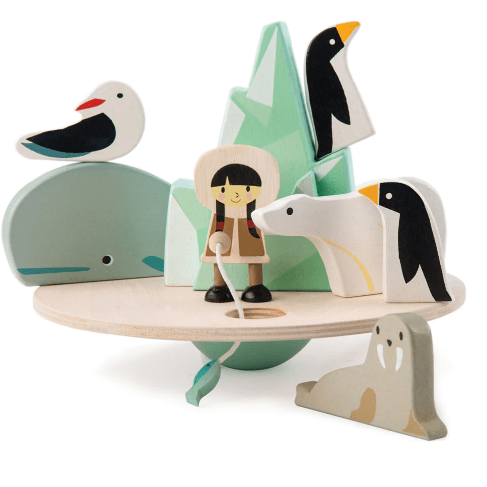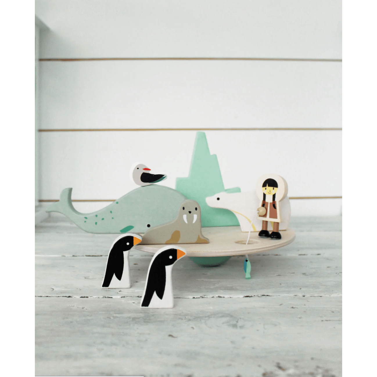 A balancing polar circle, with 2 penguins, a whale, a walrus, a polar bear, a seagull, an iceberg and a little friendly Inuit fishing girl.