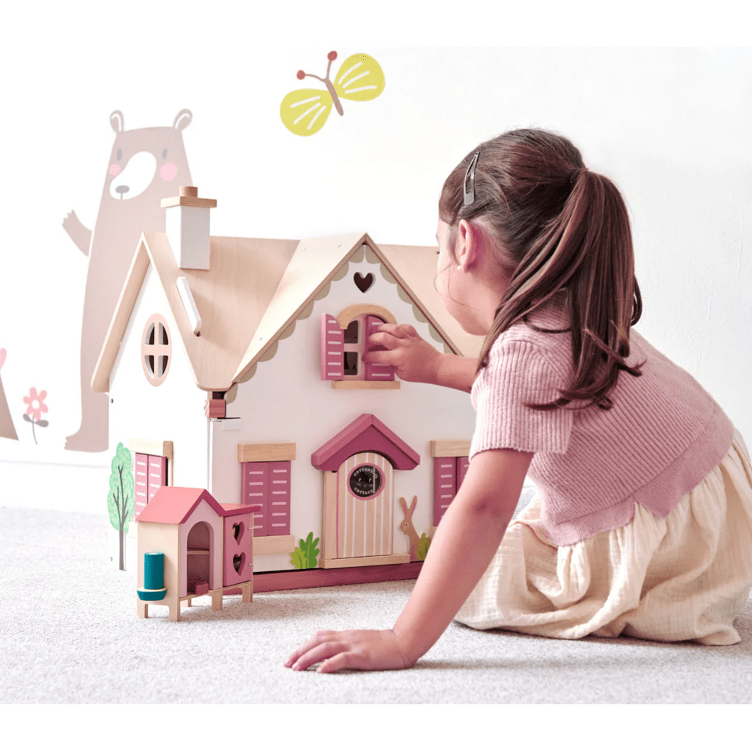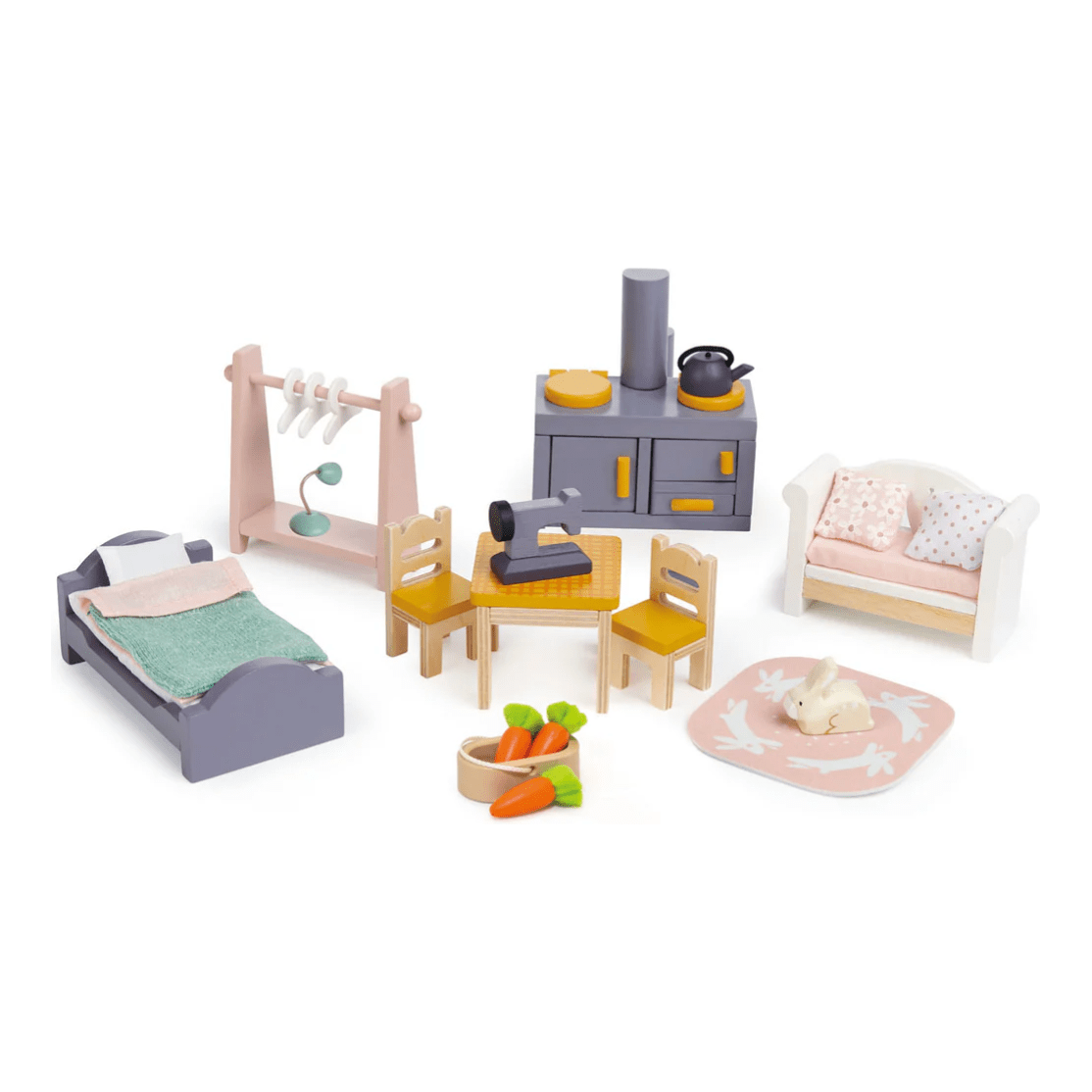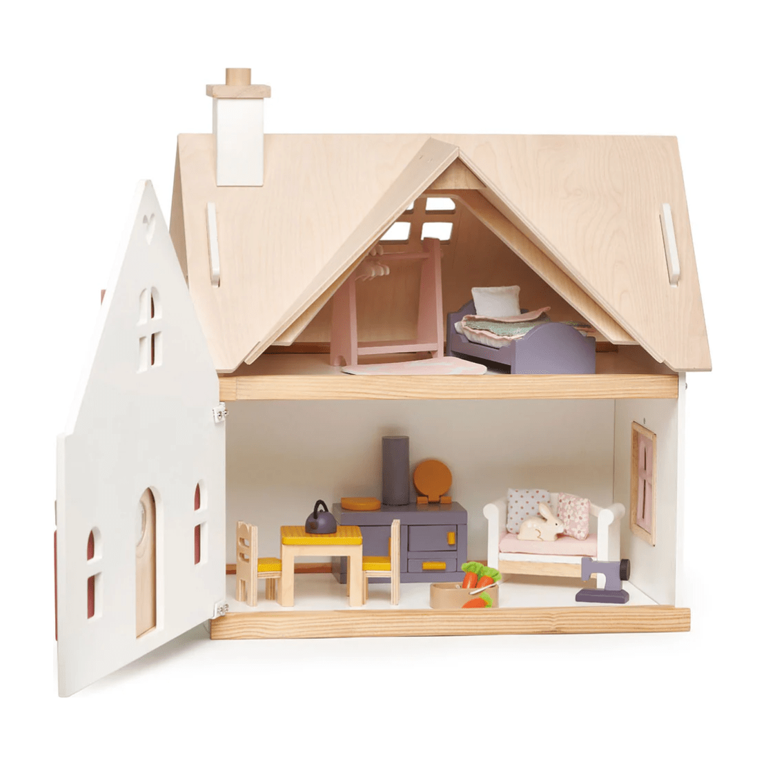 Delightful countryside cottage with a natural wood roof, shutters, cut out windows and space in the attic to make a bedroom. Includes a retro style set of furniture.