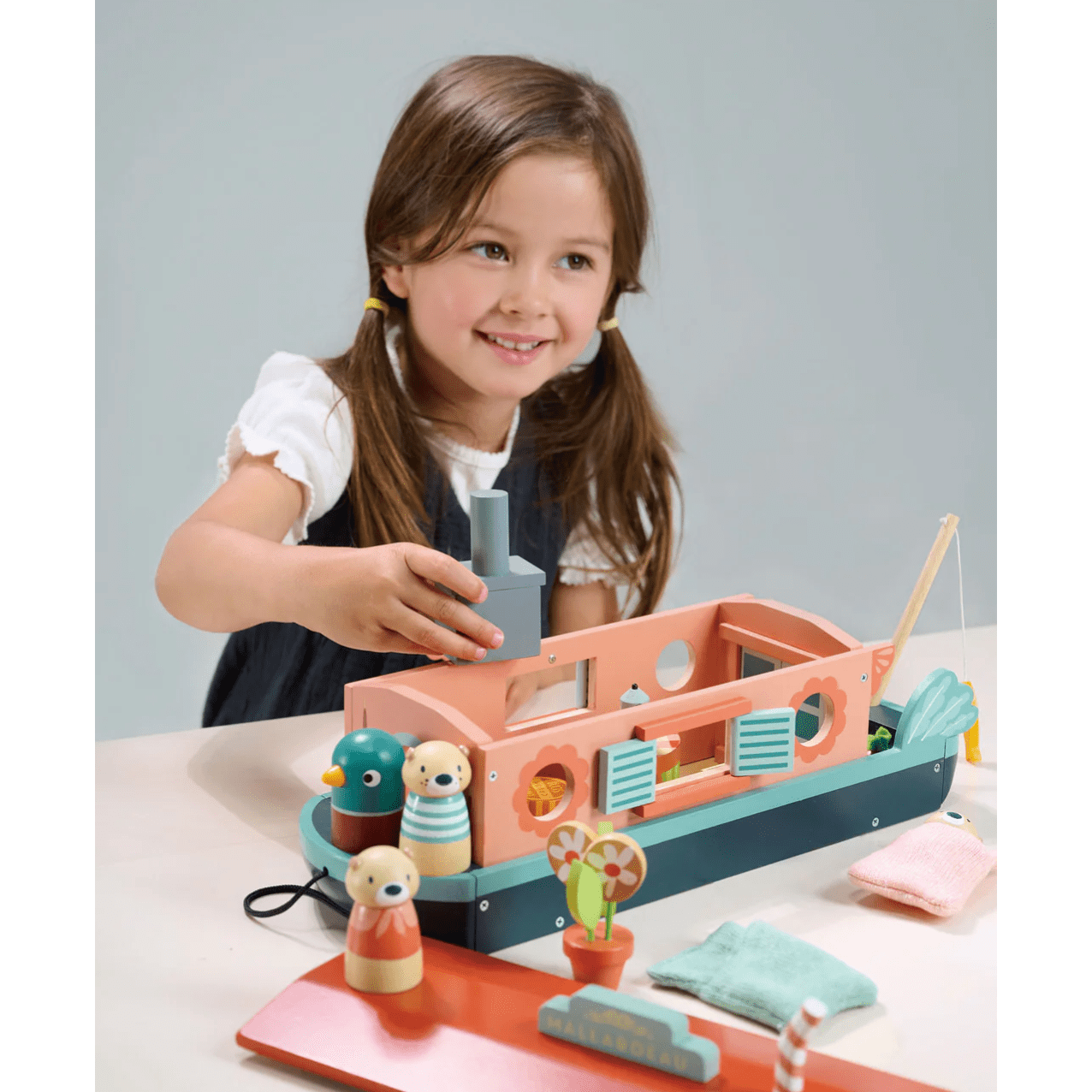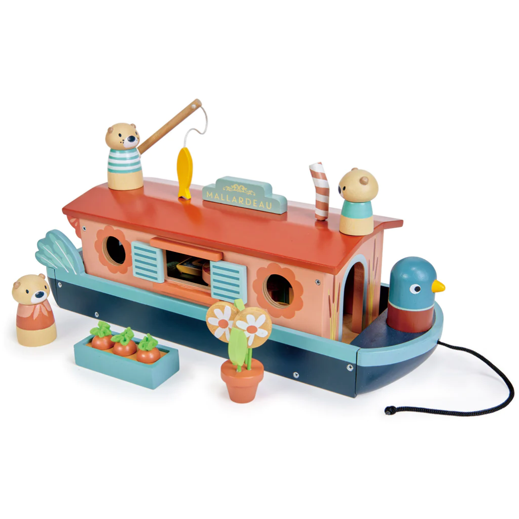 Meet our new otter family who live on the river in a beautiful canal boat called “Mallardeau”, named after their favorite mallard duck, who sits proudly at the front at the Bow end. Check out the little fishing rod at the back, and the stripy straw that doubles up as a chimney. Roof is removable and the cabin can be lifted out. Set includes: wood burning stove, matchbox drawer, jam jar lid table with matchstick legs, 3 bottle tops, 3 knitted sleeping bags, row of vegetables, millard duck wall decor, flowerpot, coffee pot and jam pot.