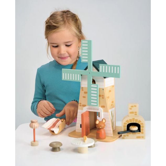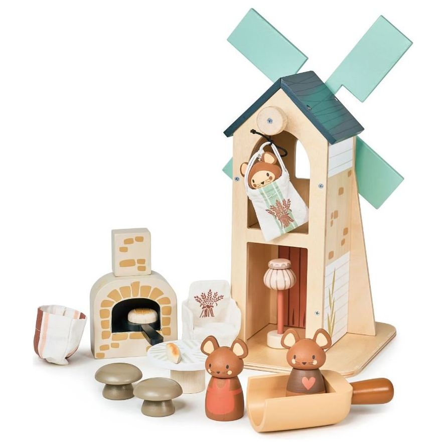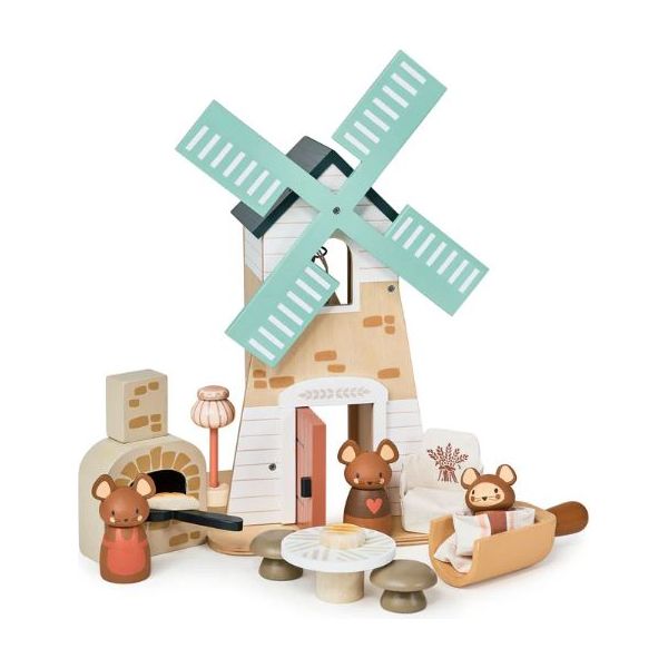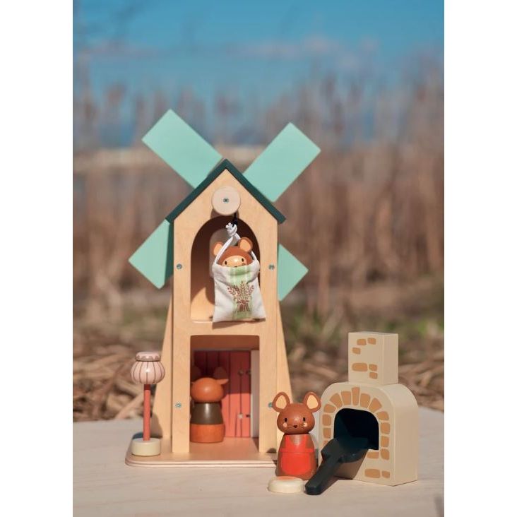 Part of our Merrywood tales range, these three little wooden toy field mice have made a perfect home in a wheat field. The windmill is 2 stories tall and has a revolving windmill which when it turns, raises a small bag up to the second story. Accessories include: a bread oven, 2 loaves of bread, a bread shovel, table and 2 stools, a grain sack, a fabric armchair, a lamp, and a flour scoop that doubles up as a bed for the baby mouse. A wonderful toy for story telling and imaginative play with children.