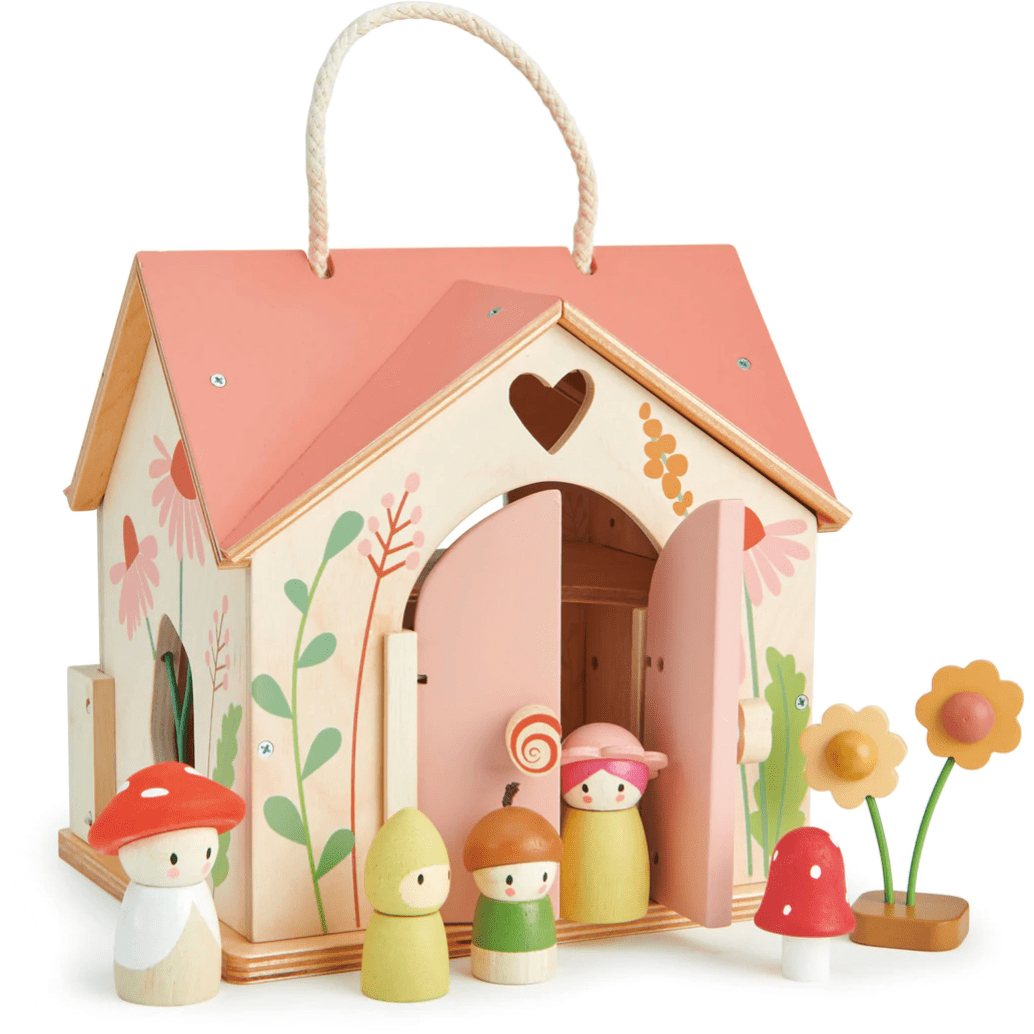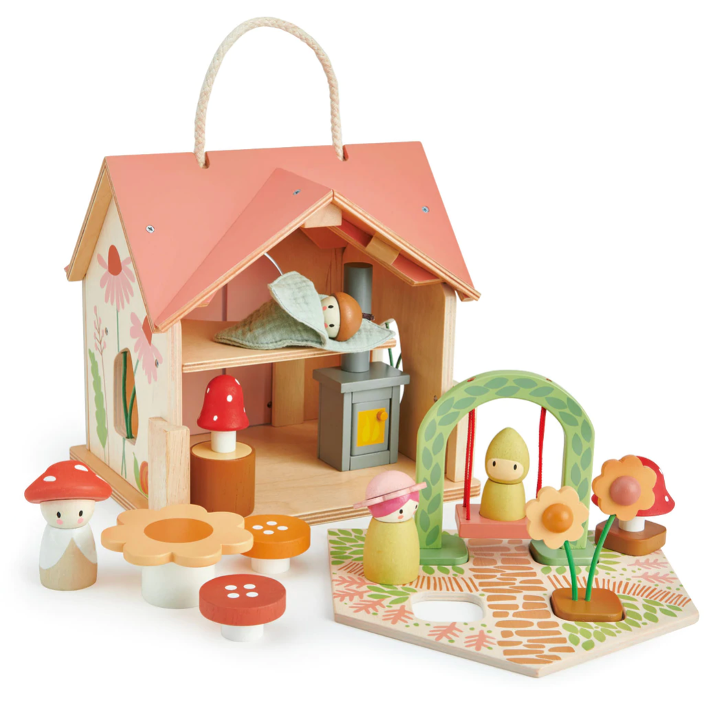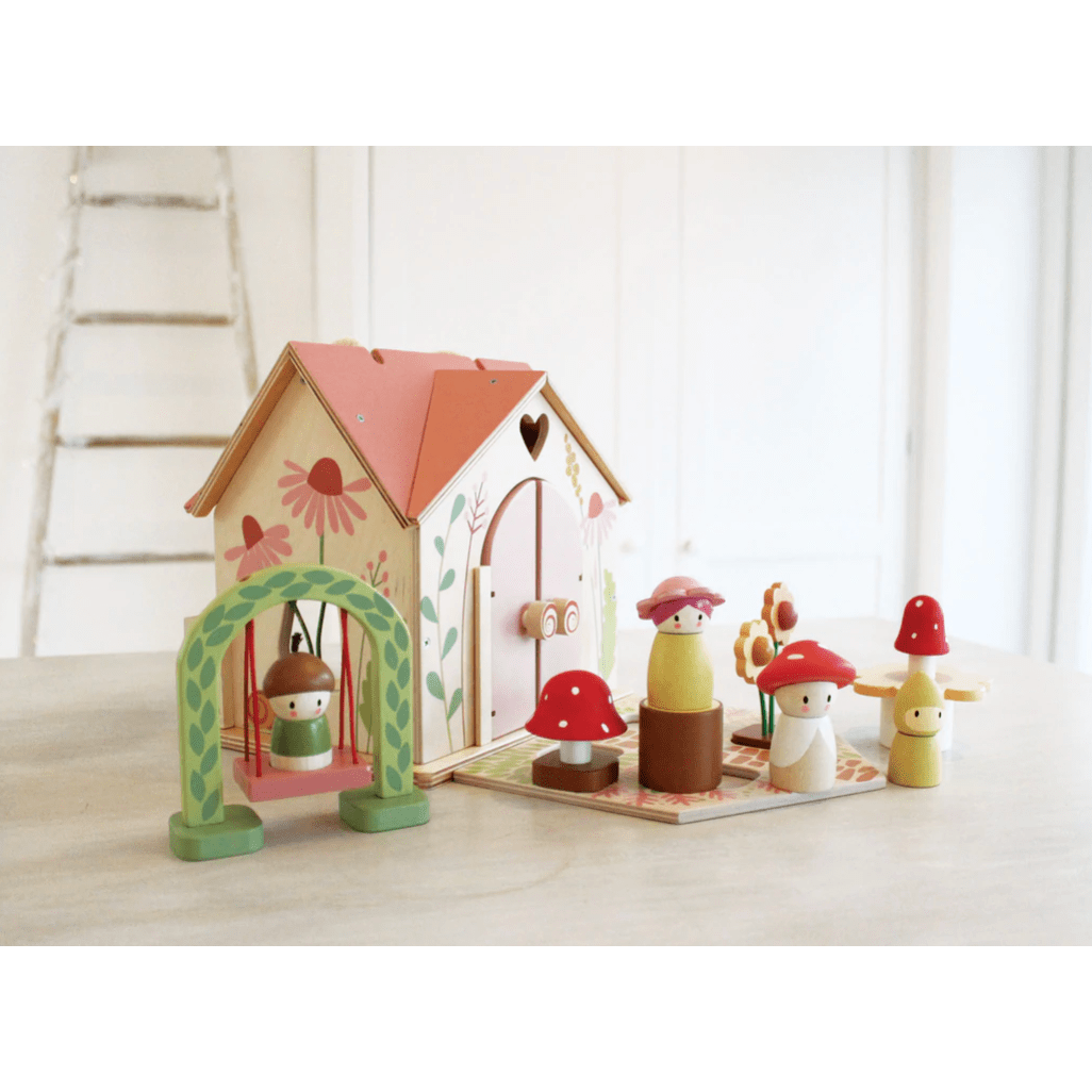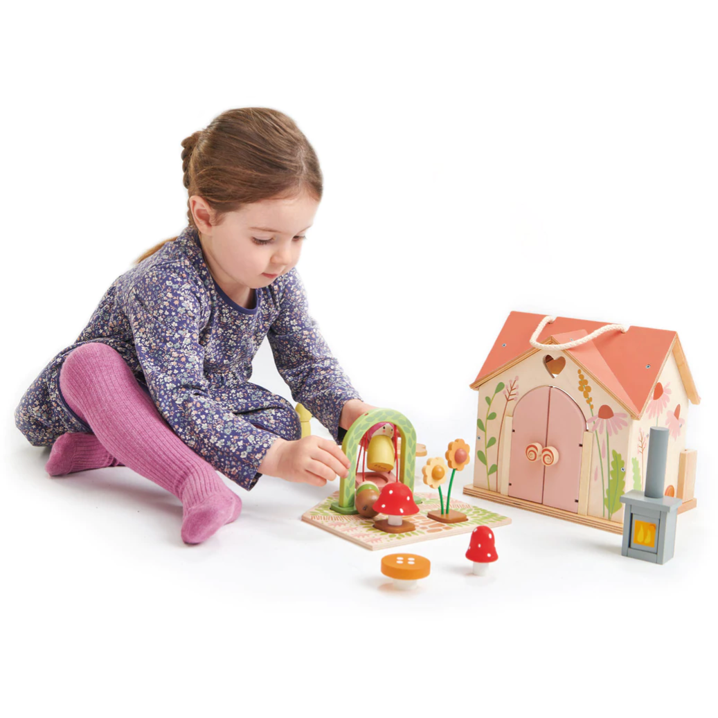 The cutest woodland cottage you ever did see. With a rose colored gabled roof, opening front doors and a removable back panel, this little house can be carried to be played with anywhere. Decorated on all sides with beautiful wild flowers, and two cut out windows which allow the flower stems to run through creating a magical meadow look. The back panel lies flat to become a garden, on to which can be placed a pretty swing, 2 flowers, and a toadstool. We have included a wood burning stove, flower table, 2 button stools, a toadstool lamp and a side table. Tuck Bud up in his leafy fabric bed, or push Corny on the swing while mummy Flora and Daddy Joey watch the stars go by.