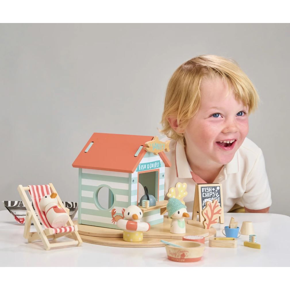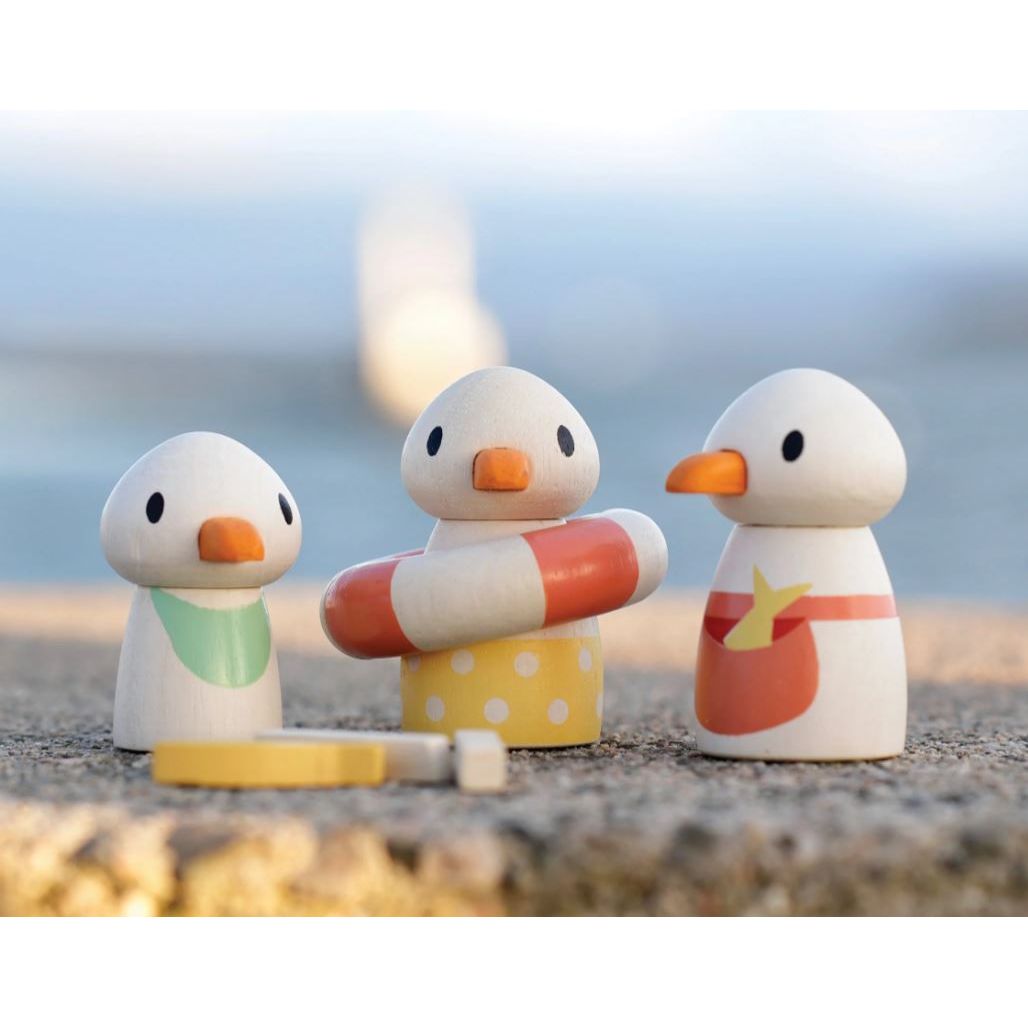 Meet Sandy the wooden toy seagull and her family down on the beach where they have inhabited a small beach hut and turned it into a fish and chips stall. Set on 2 bases of plywood that resemble sand, they have collected two pieces of seaweed, a deck chair, a kettle, a wooden tub of ice cream and spoon, three fish in a dish, a bucket with chips, a fish and chips sign, a sand castle, a piece of candy rock, and a boat made from newspaper. Check out Gully the dad seagull who has a knitted hat and a removable wooden ‘rubber’ ring. Names of the seagulls are written underneath so that these little characters can become part of a story-telling seaside adventure. Perfect for creative story-telling and imaginative play.
