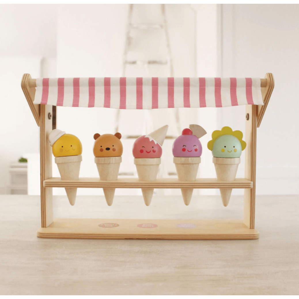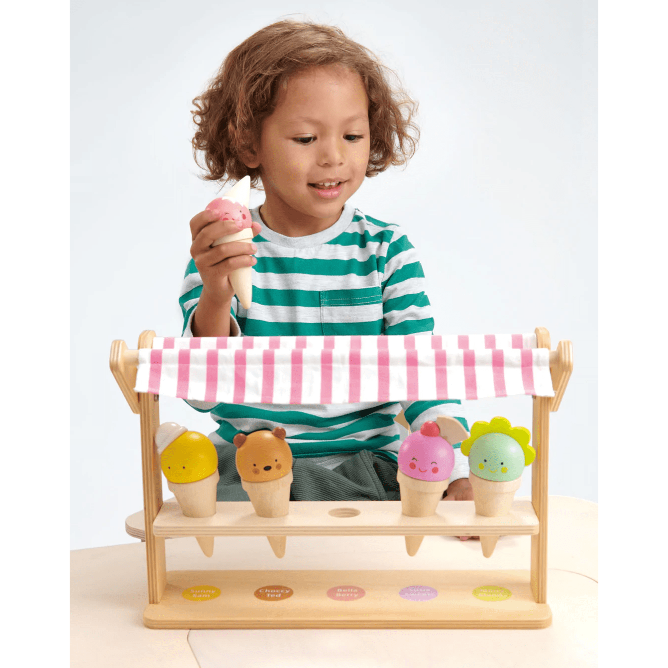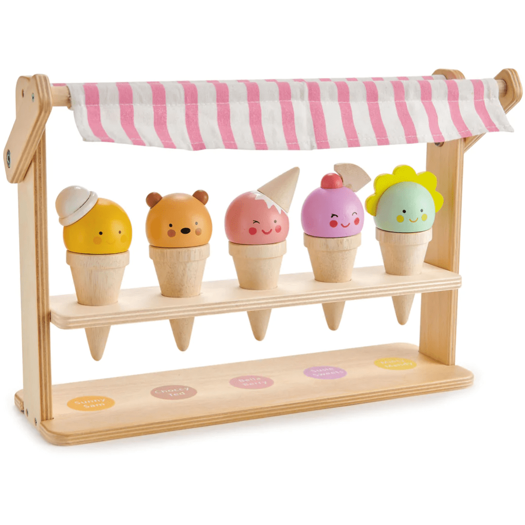 Five delicious and very friendly solid wood ice cream cornets adorn this pretty little shop. Choose your flavor and have fun matching the characters to their names.
