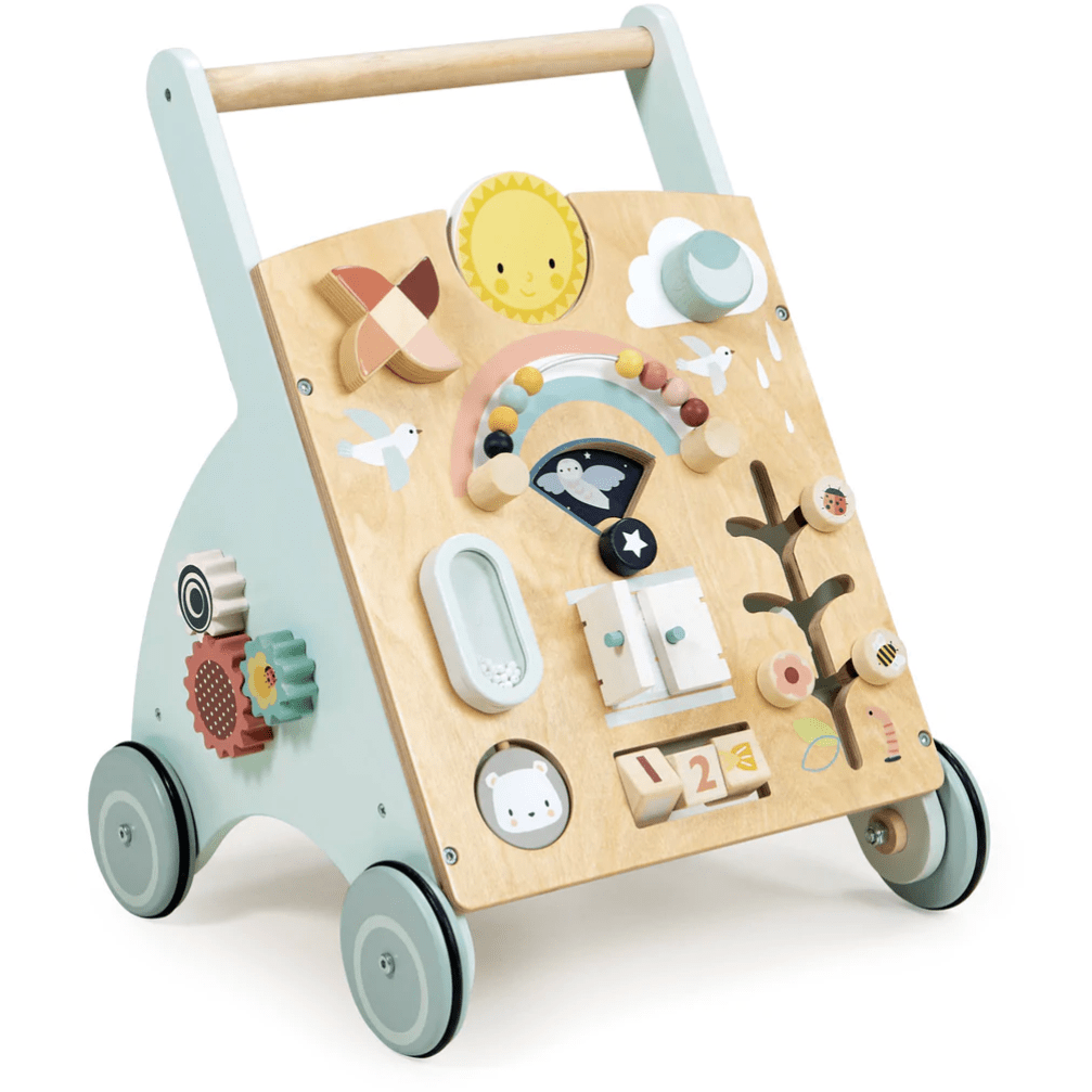 A contemporary and stylish activity walker designed for toddlers learning to take their first steps. Inspired by the weather, we have included a sun that flips to a mirror, a windmill that turns, a rainbow wire toy with beads, a clacking crescent moon on a cloud, a small snow sound maker, a flipping polar bear face and snowflake, a window that opens to a snow bunny, a cut-out stem to run some disks along, rotating cubes illustrated on all four sides and a small window with rotating button to reveal different illustrations.
