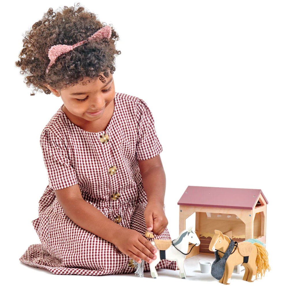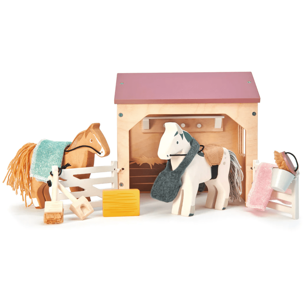 Feed the ponies with a bale of hay and a nose bag. Keep it all neat and tidy with the bucket, spade and broom, which can be hung up on some hooks on the inside wall.