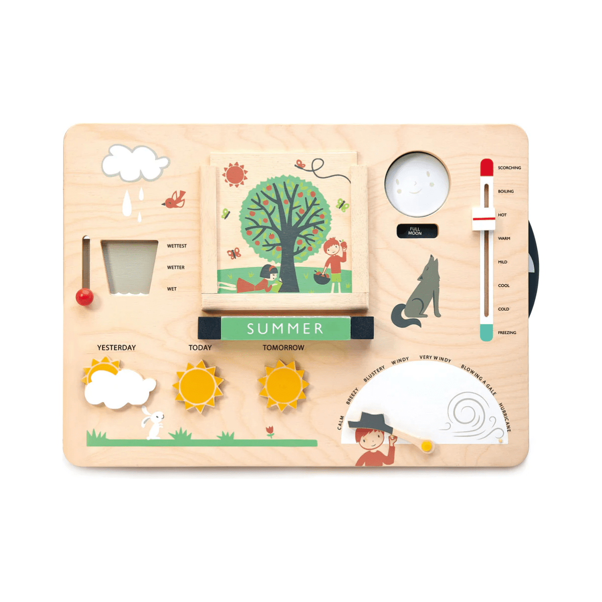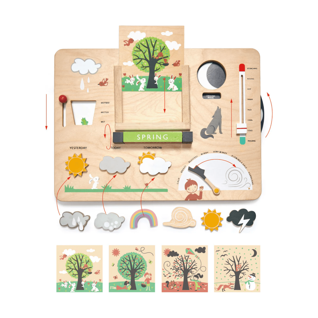 A top-quality illustrated wood Weather station that links all aspects of climate into a simple and educational board that can be hung up on a classroom wall or played with on a tabletop. Rainfall, wind speed, temperature, seasons and a daily 'what is the weather like today' as well as a novel moon phase wheel teaches about cycles.