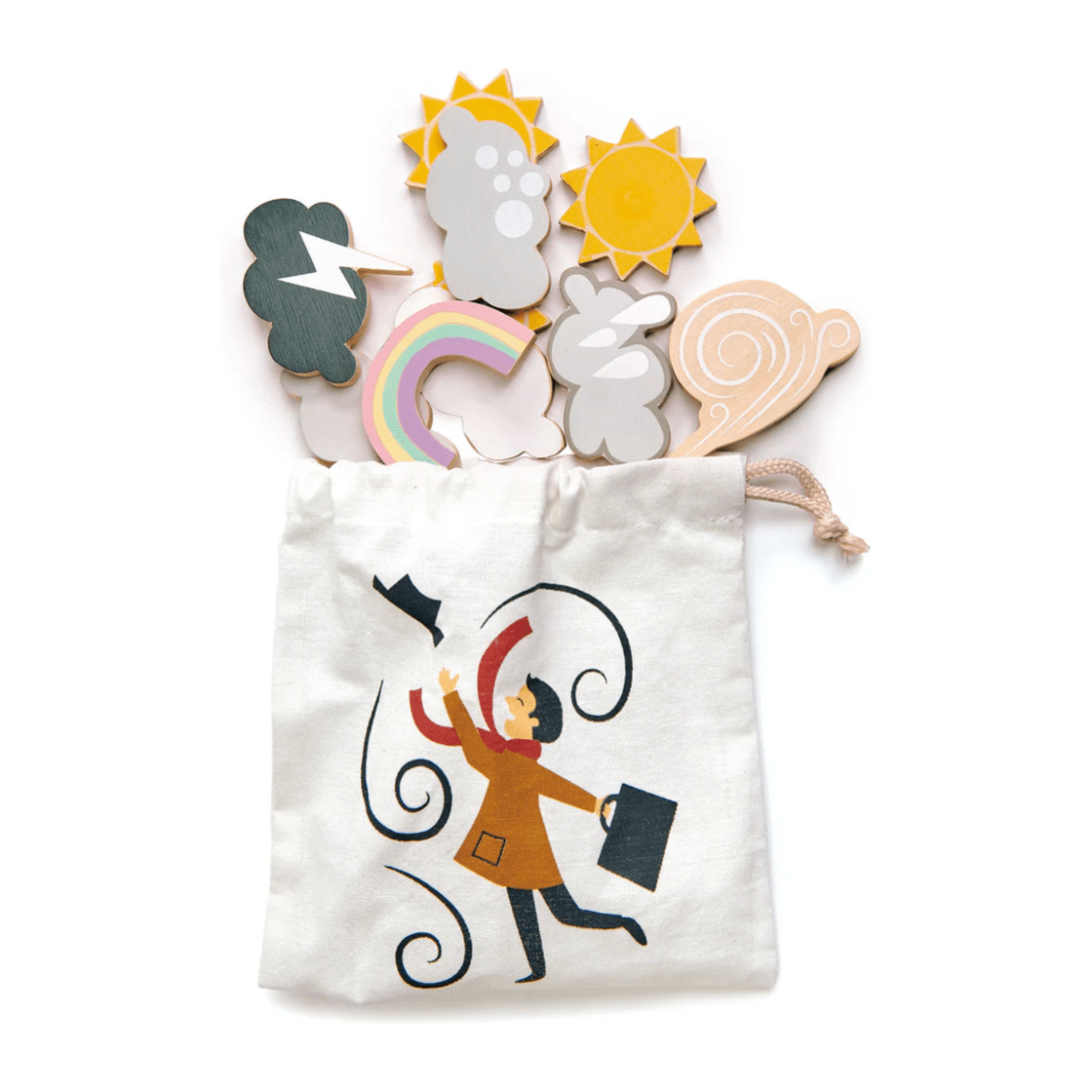 Turn a wheel to see the 8 phases of the moon and their names, move the temperature band to see the temperature rise and fall, lift the hat of the little boy to show how windy it is, and move the lever up and down the bucket to show how high the rainfall is. Kept safe in a printed drawstring bag are 9 weather symbols to magnetically place on yesterday, today and tomorrow forecasts.