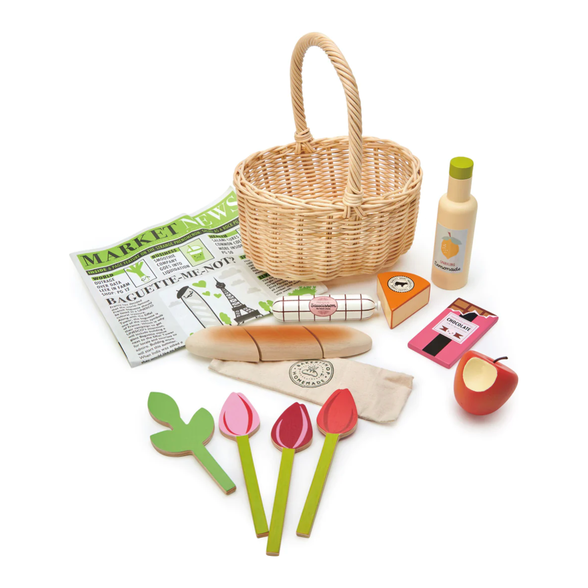 Go shopping just like mum and dad! A gorgeous handcrafted wicker basket containing a bar of chocolate, a bottle of lemonade, a continental salami, some cheese, a baguette in a cloth bag, three tulips and a leaf. An apple with a bite taken out of it, and a newspaper.