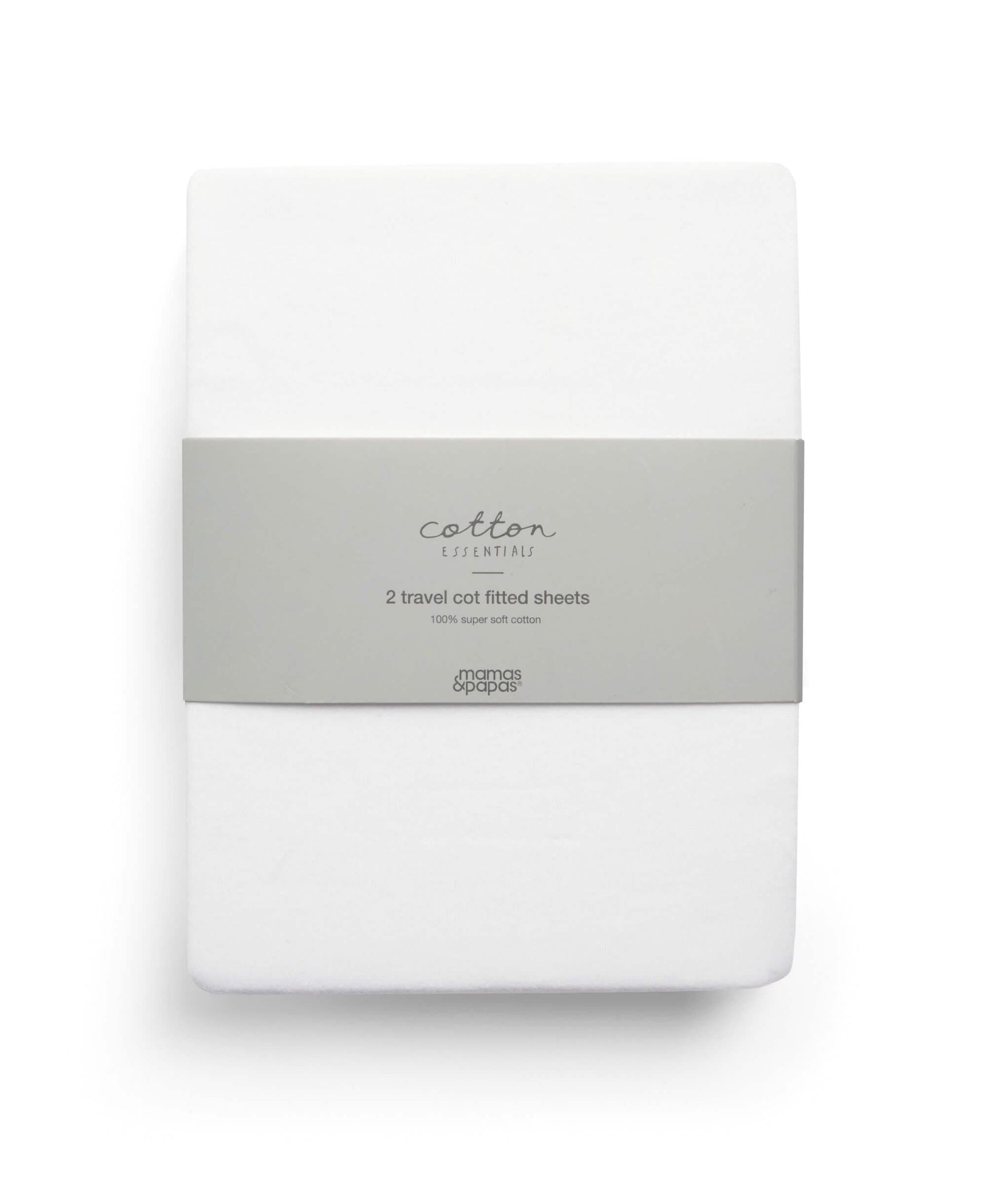 2-pack of fitted white travel cot sheets. Made from 100% cotton. Designed to fit snugly over mattress. Machine washable.