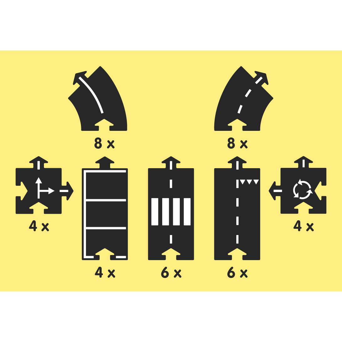 - 16 curves, 16 straights, 4 intersections and 4 roundabouts