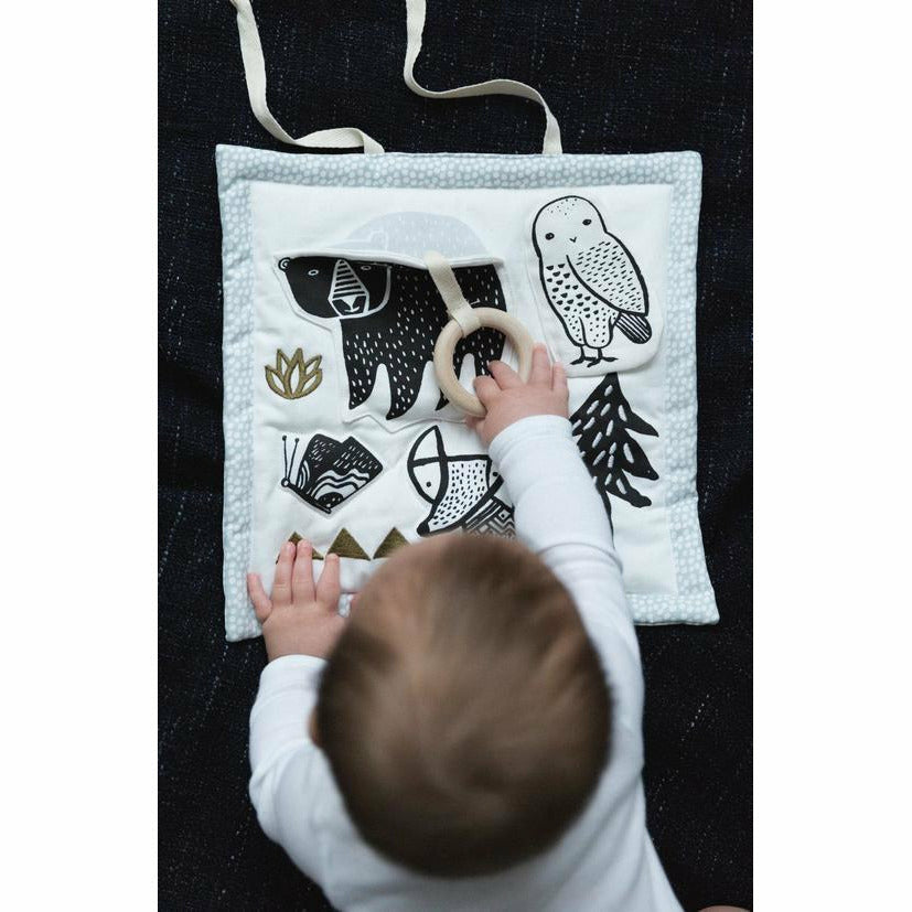 The Woodland Activity Pad keeps your baby stimulated with a variety of sensory stimulation from high contrast graphics, and hidden items including crinkly features, a rattle, a squeak and a maple wood teething ring hidden behind the bear.