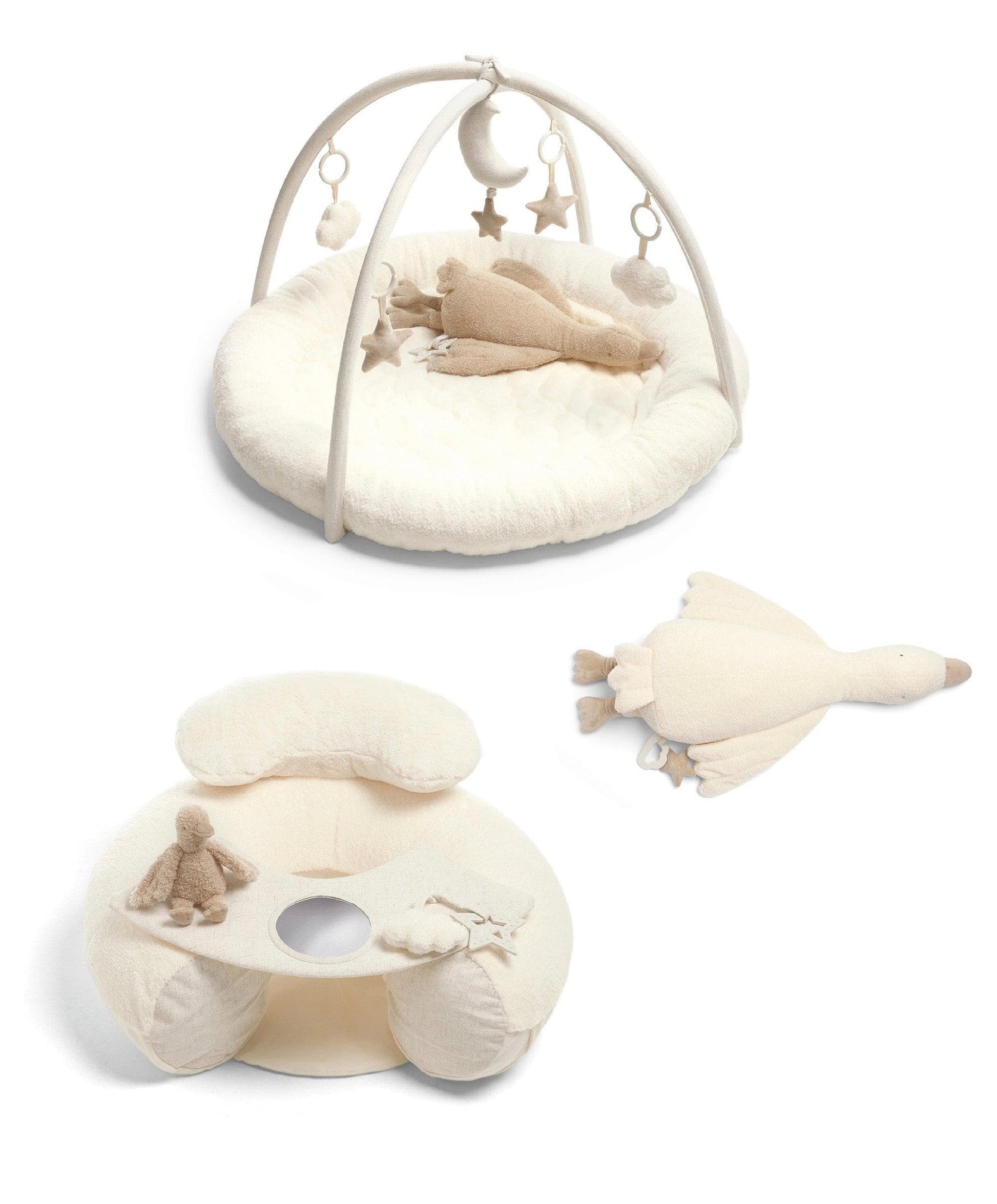 This bundle includes: Welcome to the World Duckling Playmat & Gym, Sit & Play Baby Floor Seat & Tummy Time Duck