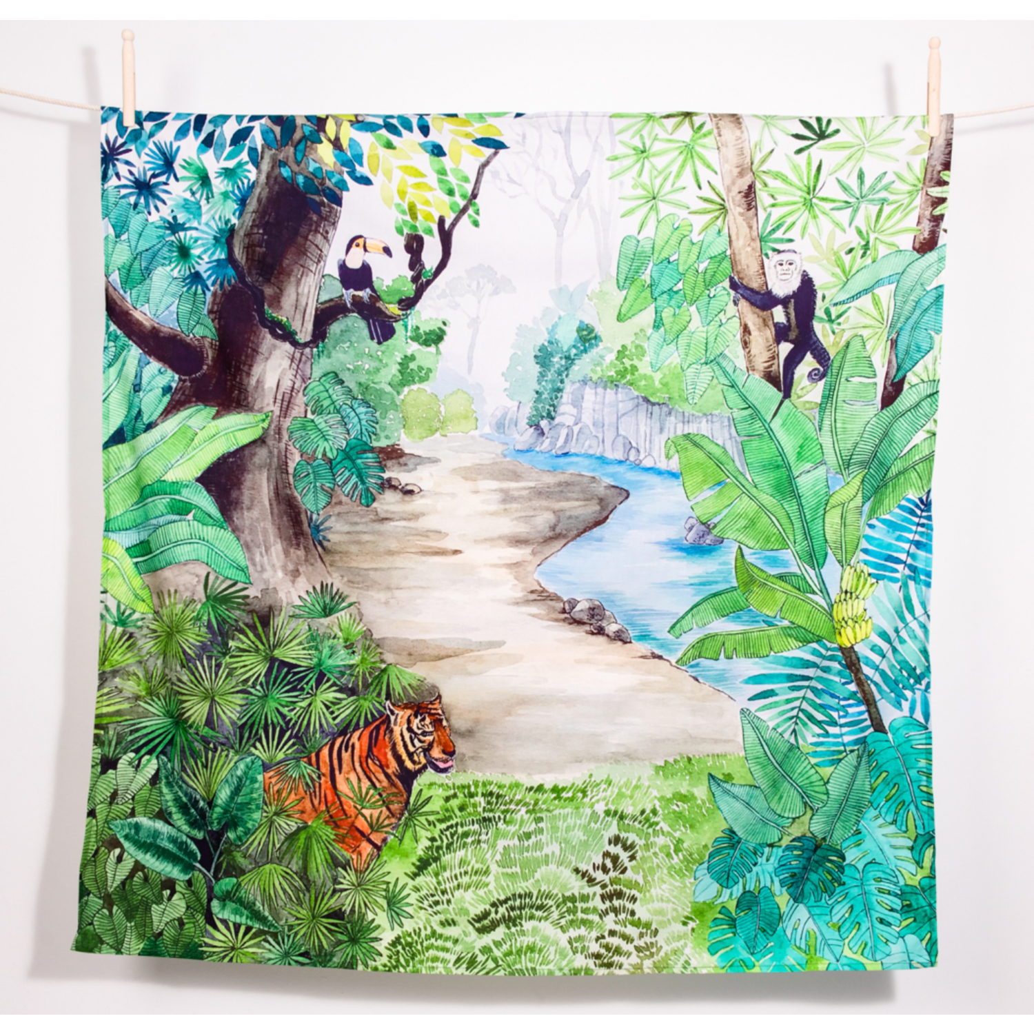 Spot a majestic tiger hiding amidst the lush foliage and a toucan perched on a branch. Imagine hearing the soothing sounds of a gushing river and wonder what else might be hiding amongst the ferns and leaves. This amazing piece brings the untamed wilderness into your space.