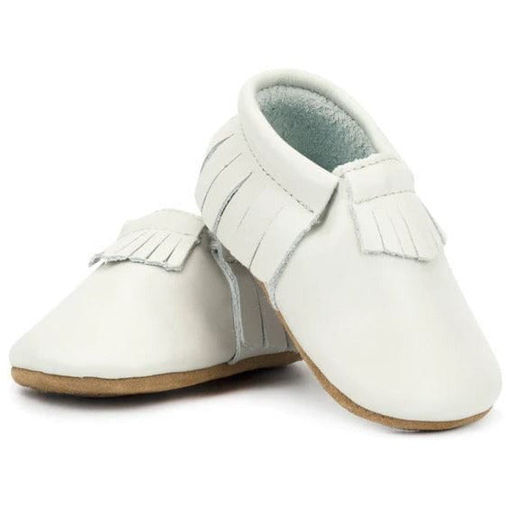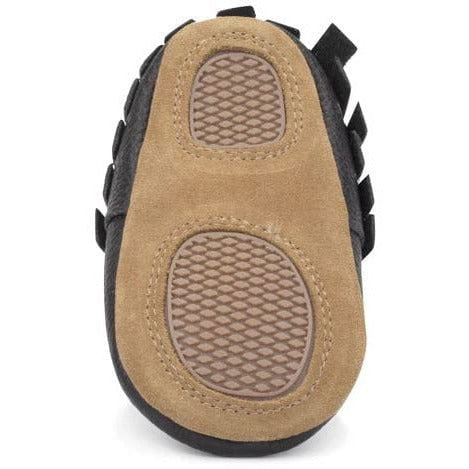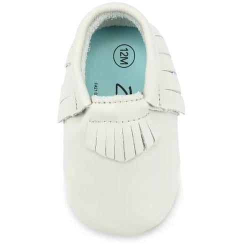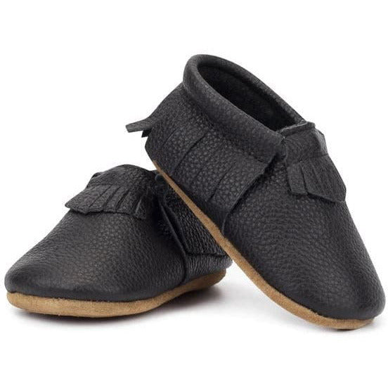 Our Fringe Moccasins are a new, exciting addition to our growing leather baby shoe collection. Fringe styling on the tongue, sides and heel give them a pop of flair while a sturdy but flexible non-slip outsole makes them the perfect shoes for babies learning to walk.